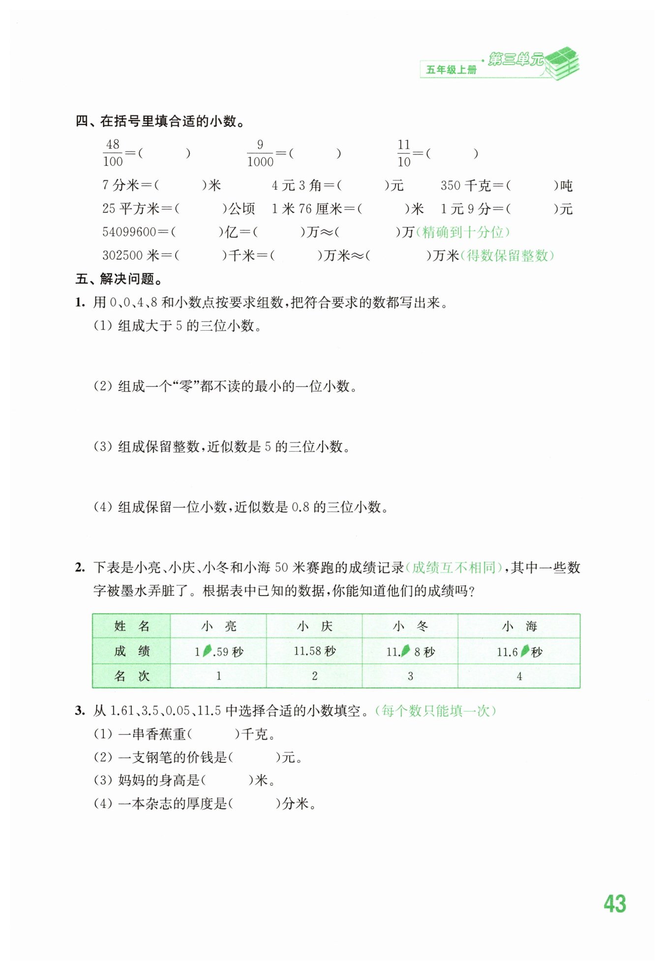答:小亮成績?yōu)?0.59秒,小慶為11.58秒,小冬為11.68秒,小海為11.69秒。