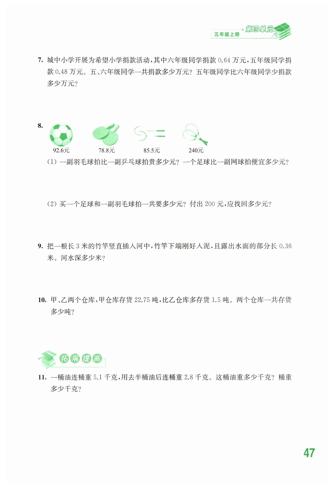 答:一副羽毛球拍比一副乒乓球拍貴6.7元。 一只足球比一副網球拍便宜147.4元。