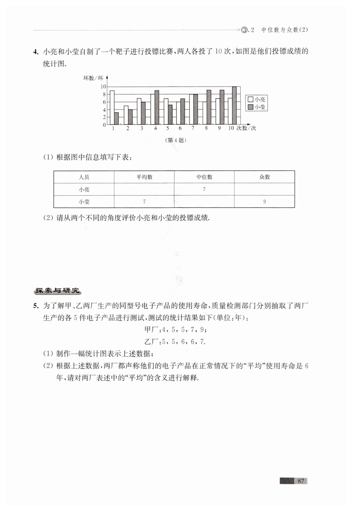 小瑩的中位數(shù)大,說明小瑩的成績比小亮好