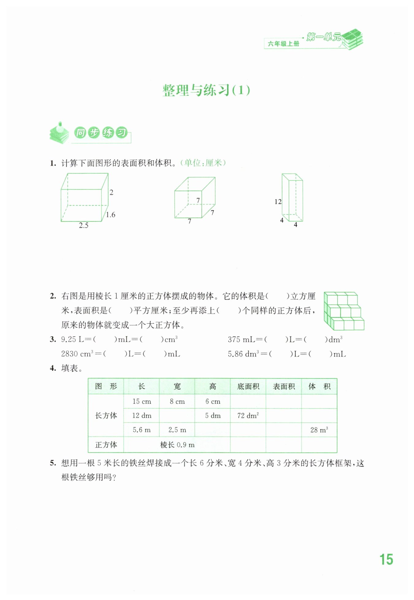 表面積:7×7×6=294 (平方厘米) 體積:7×7×7=343 (立方厘米)