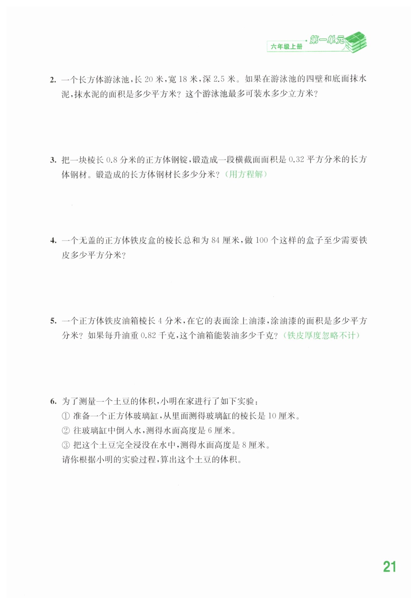 10×10×(8-6)=200 (立方厘米) 答:這個(gè)土豆的體積是200立方厘米。