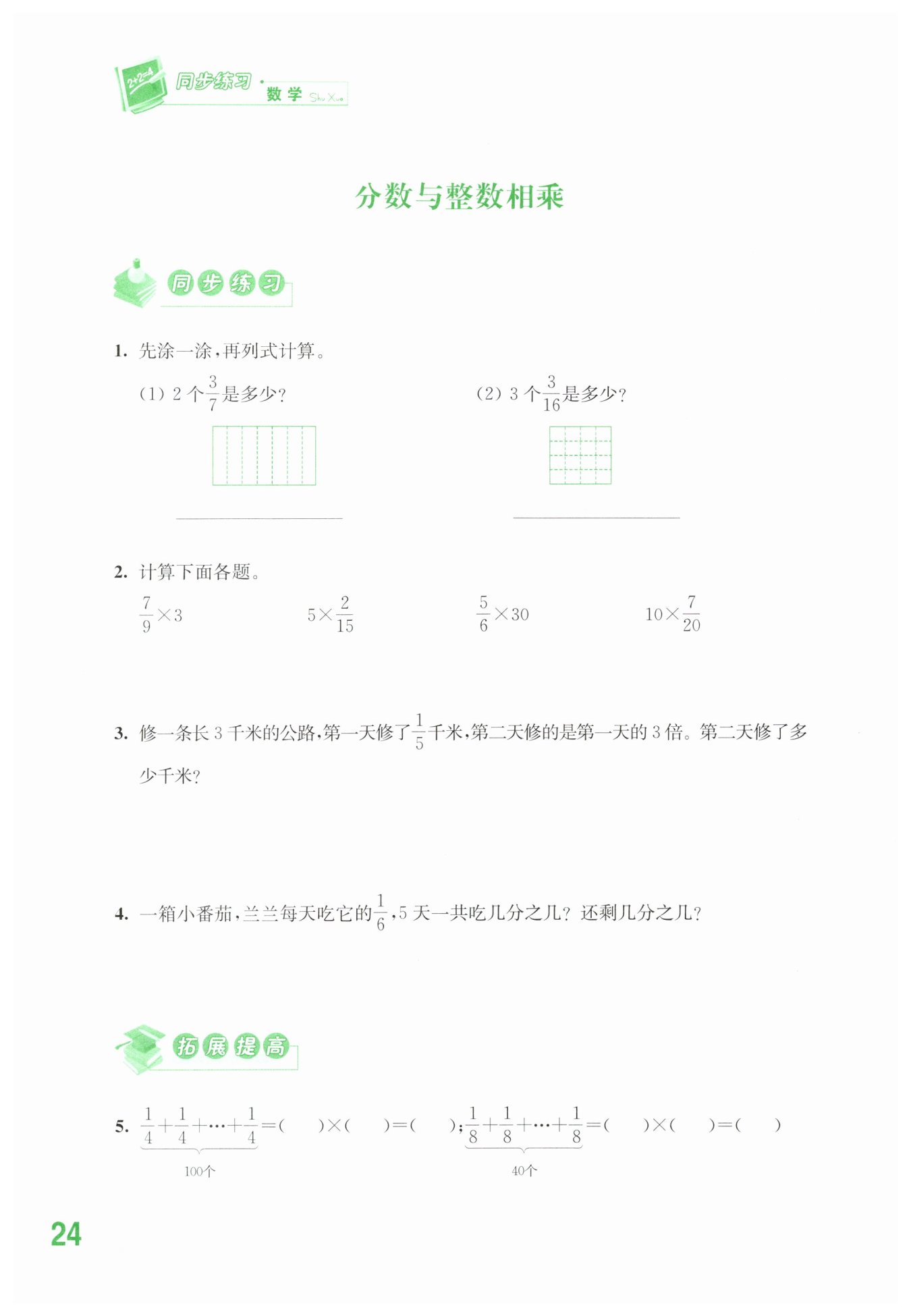 答:5天一共吃了$\frac{5}{6},$還剩$\frac{1}{6}。$