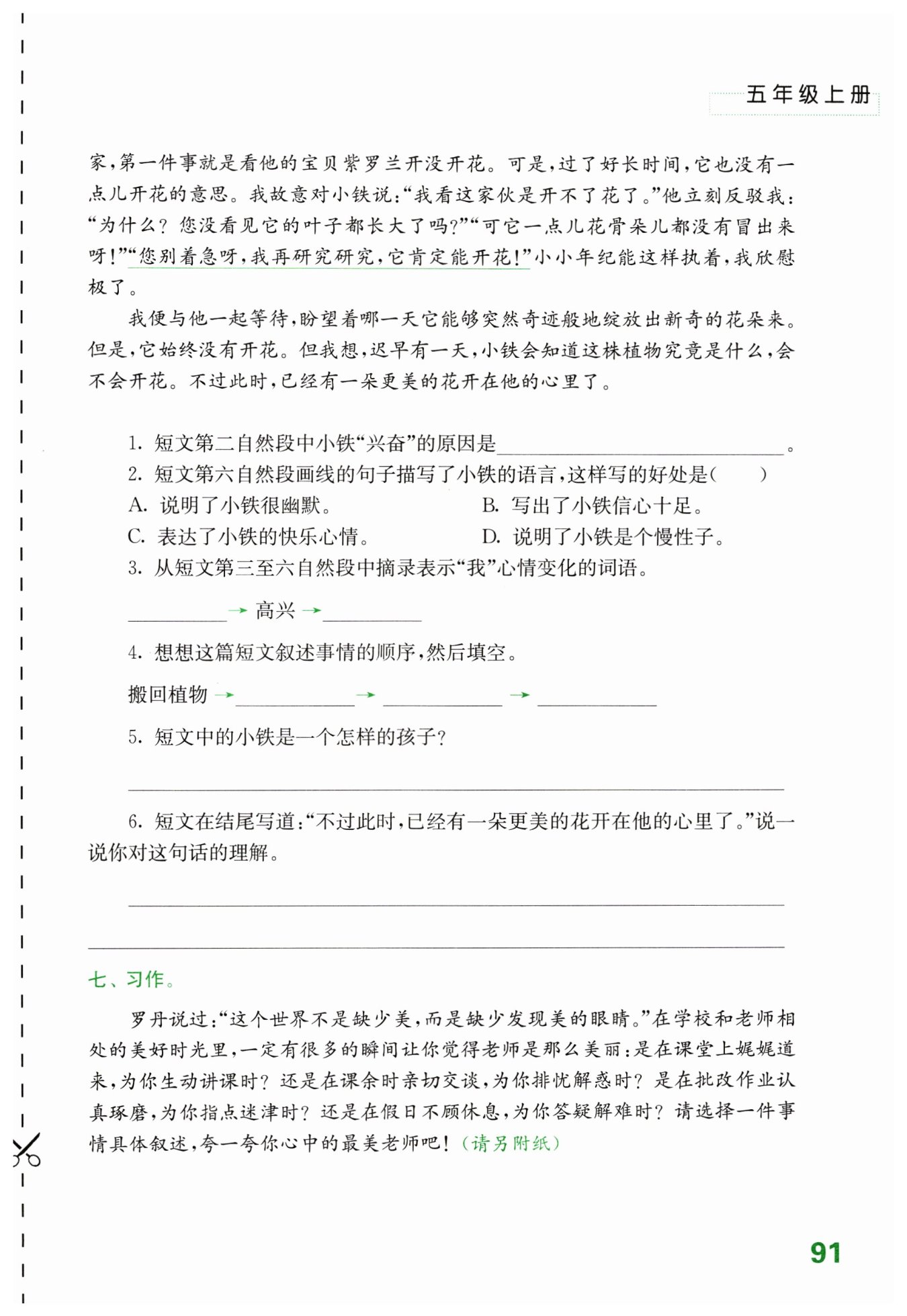 文章中兒子給一棵植物命名為紫羅蘭,并且為此查找書籍,每天期盼它開出花朵,花兒最終沒有開放,但是兒子卻因?yàn)檫@棵花熱愛科學(xué)、勇于探索、善于想象,這也是最美的花。