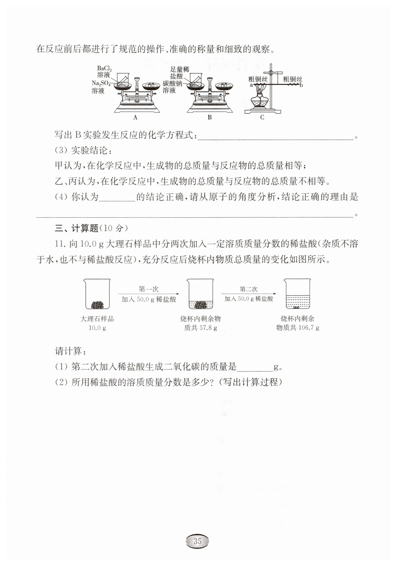 所用稀鹽酸的溶質質量分數(shù)為?$\frac { 3.65 \mathrm {g}}{ 50 \mathrm {g}}×100%= 7.3 %$?