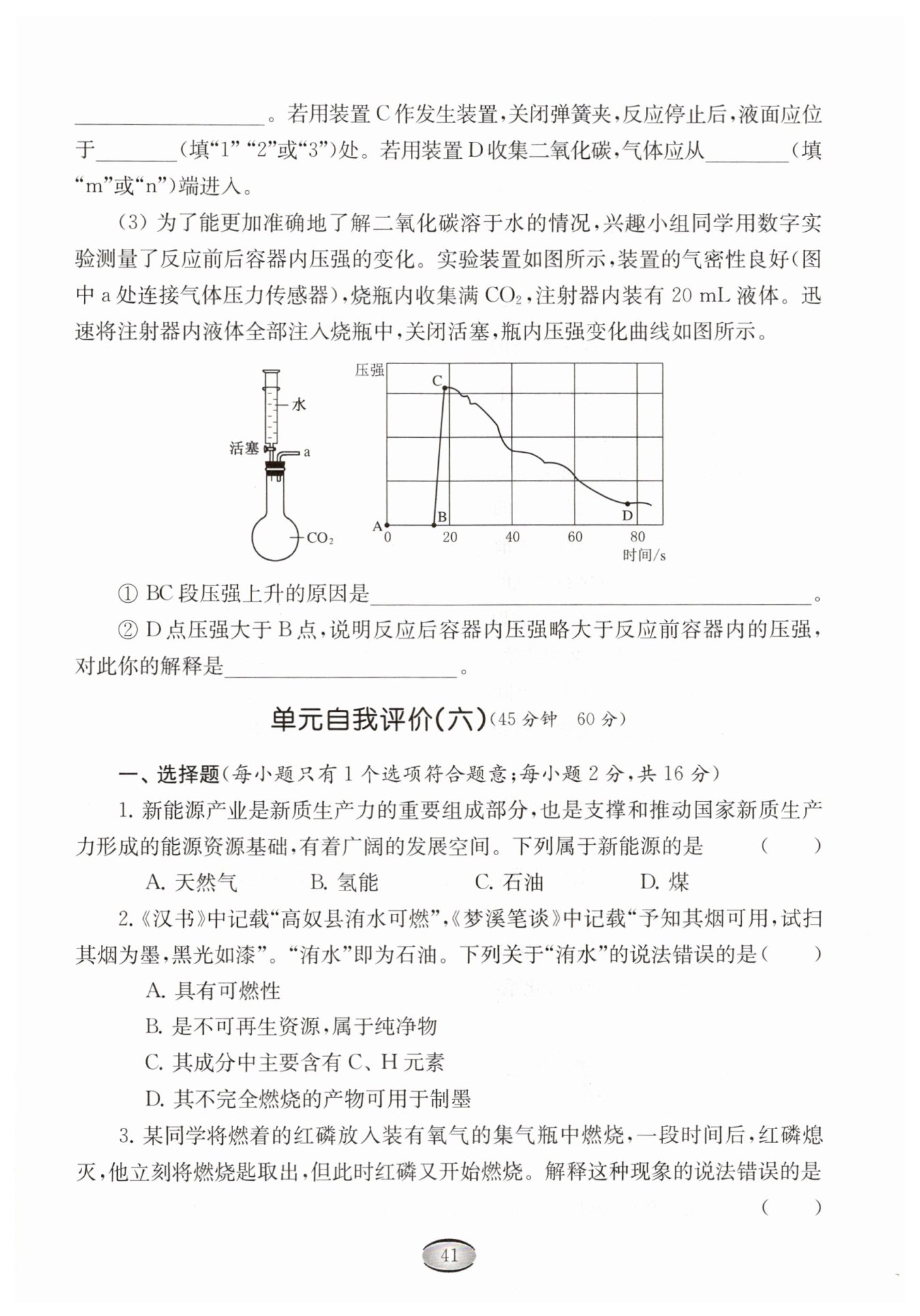 二氧化碳溶于水的體積小于注入水的體積,導(dǎo)致瓶內(nèi)氣體總體積減小的程度小于液體占據(jù)的體積,所以壓強(qiáng)略大于反應(yīng)前