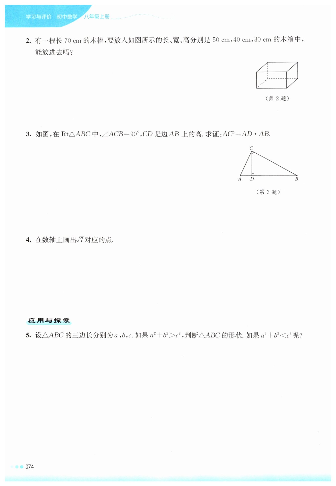 因?yàn)?70.71\,\text{cm}>70\,\text{cm},$所以能將長(zhǎng)$70\,\text{cm}$的木棒放入木箱中。
