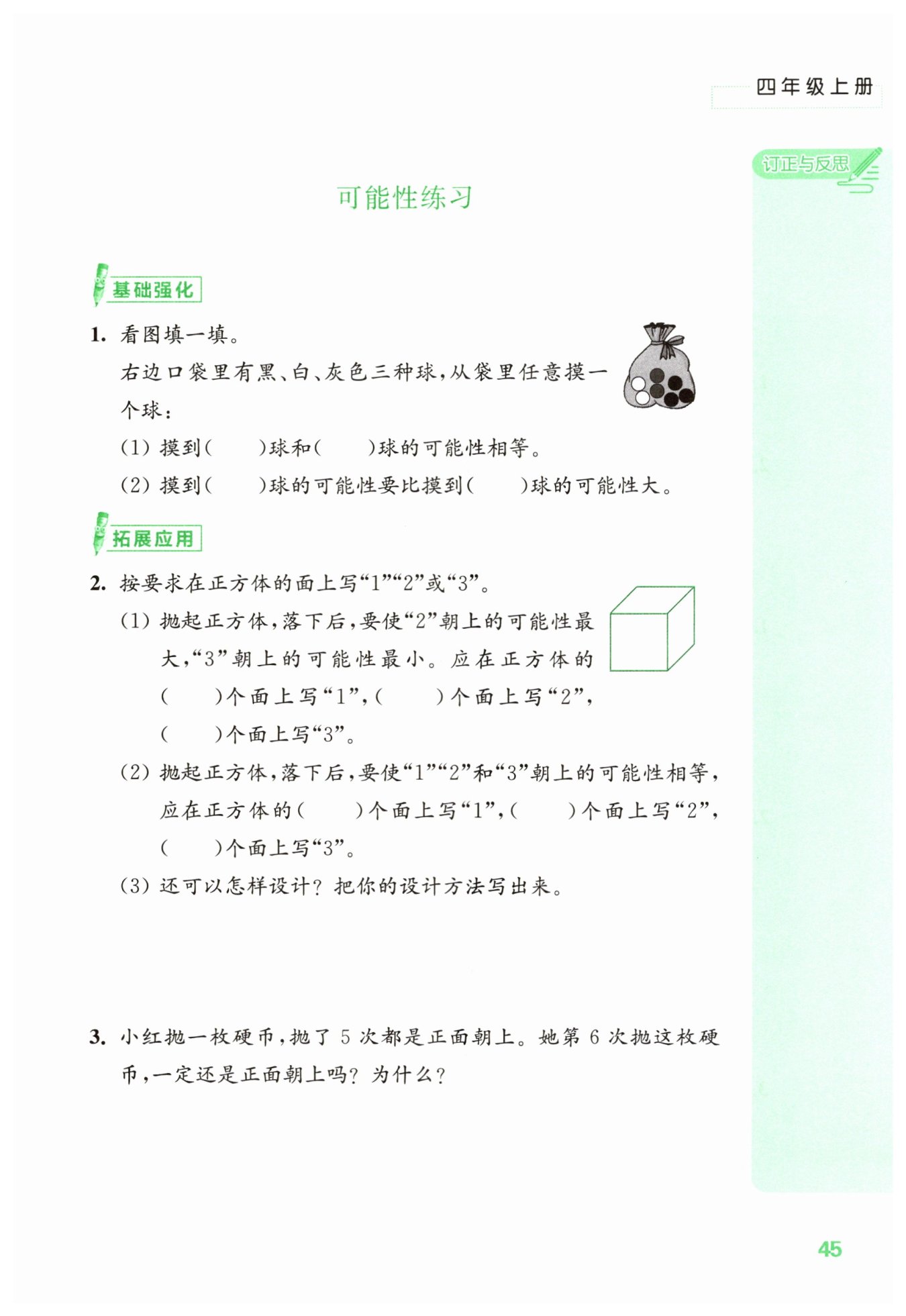 答:拋起正方體,落下后,要使“3”朝上的可能性最大,“2”朝上的可能性最小,應(yīng)在正方體的2個(gè)面上寫“1”,1個(gè)面上寫“2”,3個(gè)面上寫“3”。