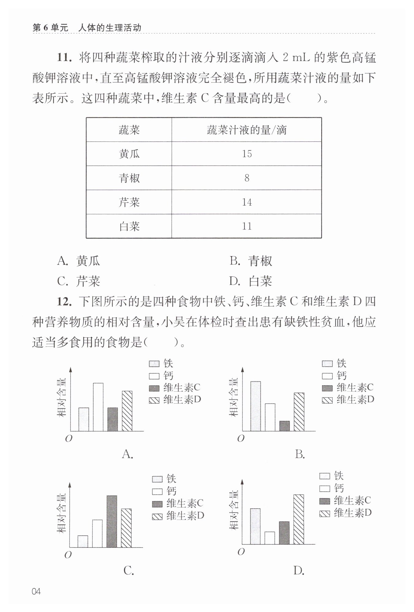 從表格中我們可以看到,不同蔬菜汁液使高錳酸鉀溶液褪色所需的滴數(shù)不同。黃瓜汁需要15滴,青椒汁只需要8滴,芹菜汁需要14滴,白菜汁需要11滴。由于維生素C的含量與使高錳酸鉀溶液褪色所需的蔬菜汁液量成反比(即蔬菜汁液量越少,維生素C含量越高),因此我們可以得出結(jié)論:青椒汁所需的滴數(shù)最少,說(shuō)明青椒中的維生素C含量最高。
