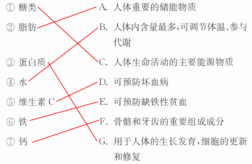 ③蛋白質(zhì)用于人體的生長(zhǎng)發(fā)育以及細(xì)胞的更新和修復(fù),故應(yīng)與G匹配。