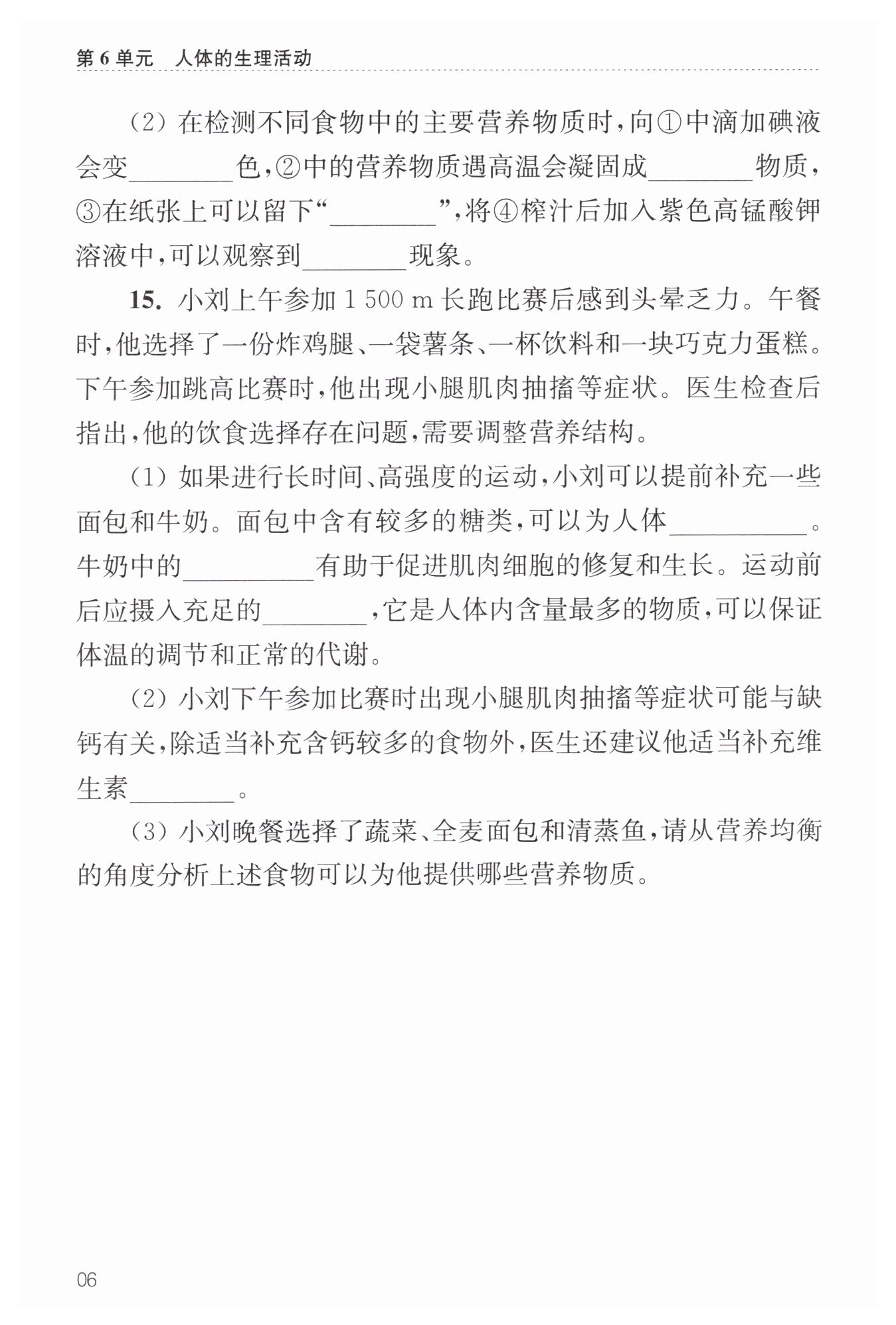 (3)蔬菜提供維生素、無(wú)機(jī)鹽、膳食纖維;全麥面包提供糖類(lèi)、膳食纖維;清蒸魚(yú)提供蛋白質(zhì)、無(wú)機(jī)鹽。