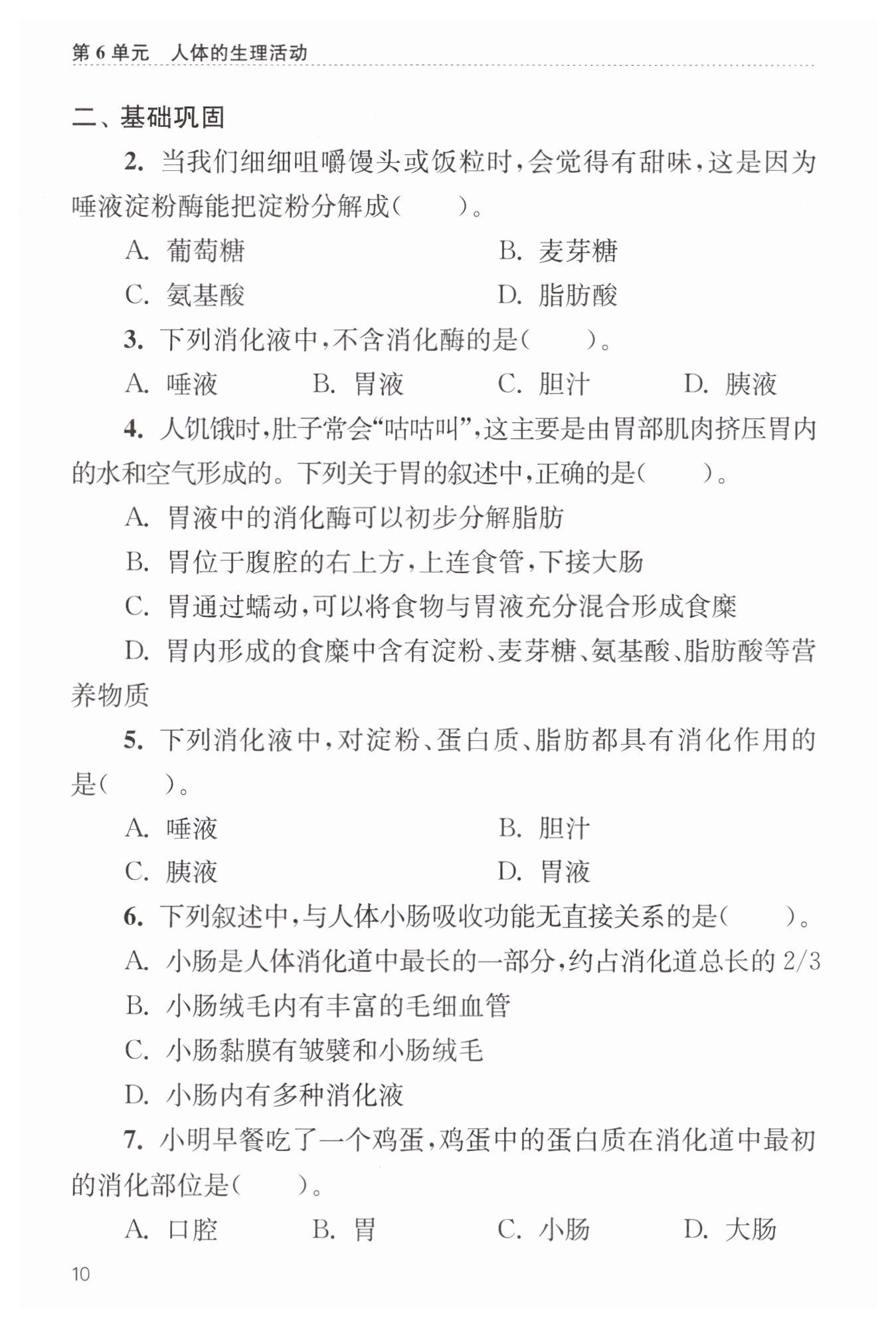 【解析】:本題考查了人體對食物的消化和吸收的相關(guān)知識,特別是唾液淀粉酶在口腔中對淀粉的分解作用。在人體消化過程中,唾液淀粉酶是一種能夠分解淀粉的酶,它存在于唾液中。當(dāng)我們在咀嚼饅頭或飯粒時,唾液淀粉酶會開始作用,將淀粉分解成較小的糖類分子。根據(jù)生物學(xué)知識,唾液淀粉酶主要將淀粉分解成麥芽糖,而不是葡萄糖、氨基酸或脂肪酸。葡萄糖是淀粉消化的最終產(chǎn)物之一,但這一過程主要在小腸中完成,而不是在口腔中。氨基酸是蛋白質(zhì)的消化產(chǎn)物,與淀粉的消化無關(guān)。脂肪酸則是脂肪的消化產(chǎn)物,同樣與淀粉的消化無關(guān)。