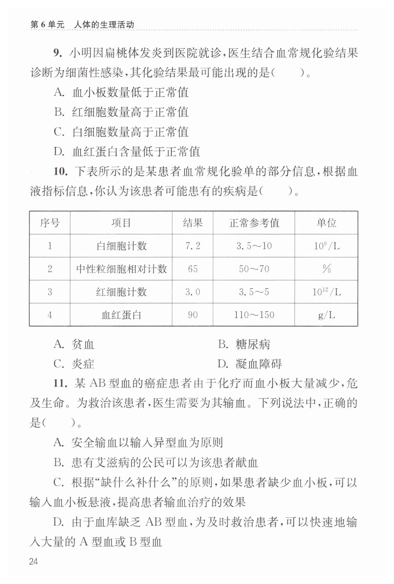 【解析】:本題考察的是對于血液成分及其功能在人體發(fā)生細(xì)菌性感染時的變化理解。在人體發(fā)生細(xì)菌性感染時,白細(xì)胞的數(shù)量通常會增加,因為白細(xì)胞是人體免疫系統(tǒng)的重要組成部分,它們能夠吞噬并消化細(xì)菌,從而幫助人體抵抗感染。而血小板主要負(fù)責(zé)血液凝固,與細(xì)菌性感染無直接關(guān)系;紅細(xì)胞主要負(fù)責(zé)運輸氧氣,同樣與細(xì)菌性感染無直接關(guān)系;血紅蛋白是紅細(xì)胞中的一種蛋白質(zhì),負(fù)責(zé)運輸氧氣,也與細(xì)菌性感染無直接關(guān)系。