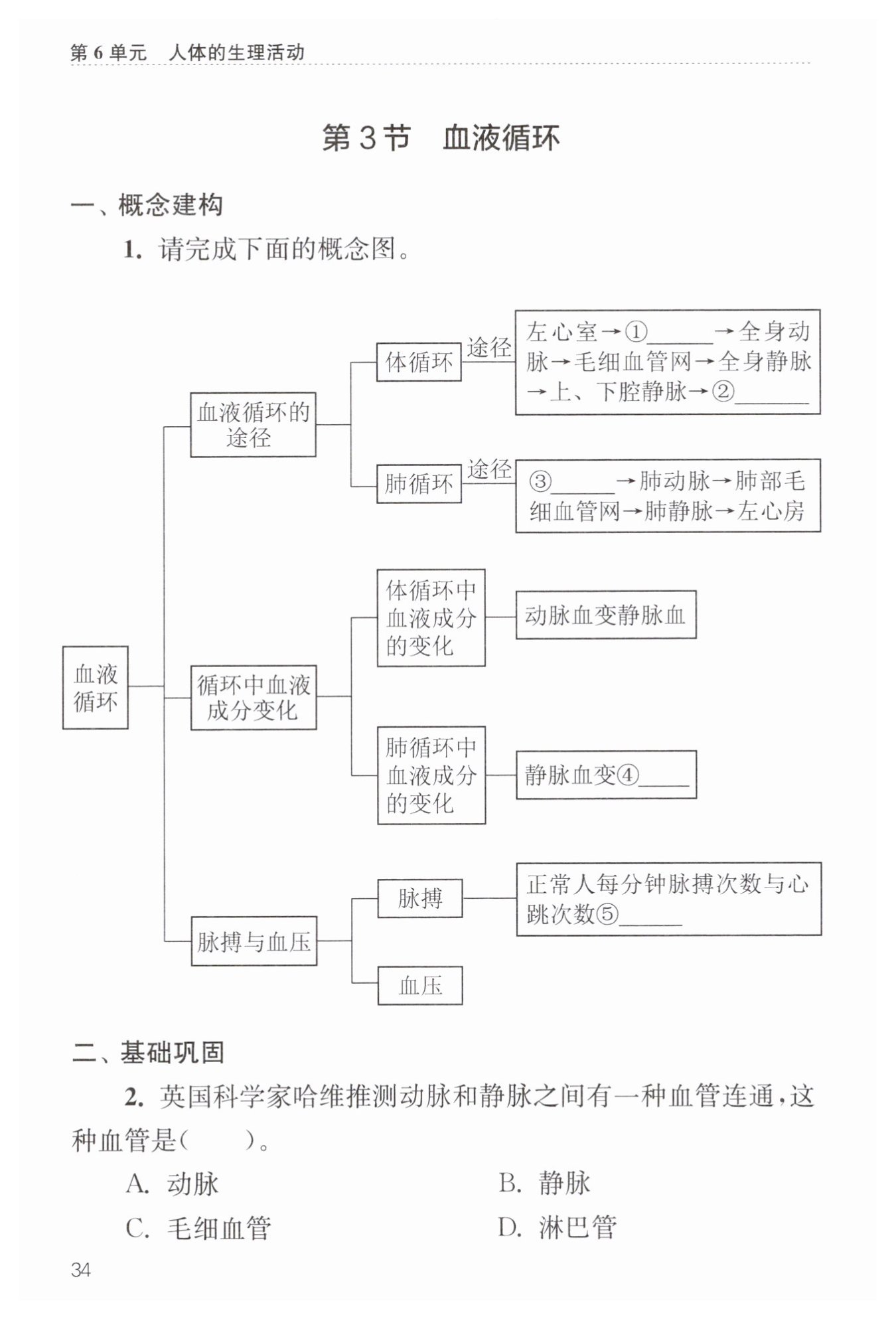【解析】:本題考查的是對血液循環(huán)系統(tǒng)中血管類型的識別。根據(jù)生物學知識,動脈是將血液從心臟輸送到全身的血管,靜脈則是將血液從全身輸送回心臟的血管。而動脈和靜脈之間,存在著一種極細的血管,稱為毛細血管,它們負責血液與組織細胞之間的物質交換。淋巴管則與淋巴系統(tǒng)相關,不直接參與血液循環(huán)。根據(jù)哈維的推測以及血液循環(huán)系統(tǒng)的結構,動脈和靜脈之間連通的血管應該是毛細血管。