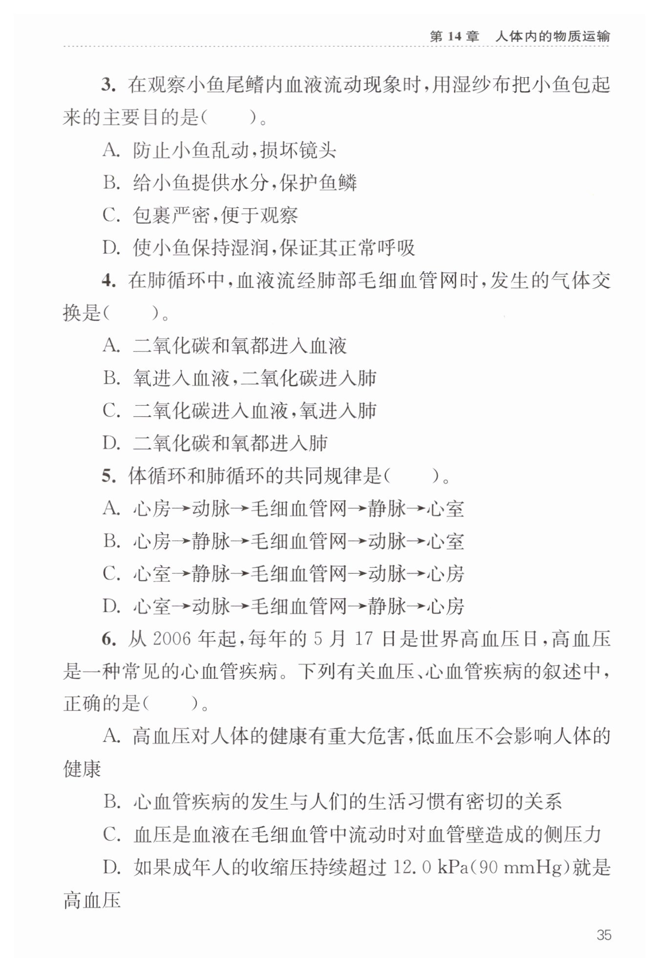 【解析】:本題考察的是觀察小魚尾鰭內(nèi)血液流動(dòng)現(xiàn)象的實(shí)驗(yàn)知識(shí)。在實(shí)驗(yàn)過(guò)程中,用濕紗布把小魚包起來(lái)的主要目的是為了保持小魚的濕潤(rùn),從而保證其正常呼吸,因?yàn)樾◆~是水生動(dòng)物,需要在濕潤(rùn)的環(huán)境中才能呼吸。A選項(xiàng)防止小魚亂動(dòng),損壞鏡頭,雖然濕紗布在一定程度上可以限制小魚的活動(dòng),但并非主要目的;B選項(xiàng)給小魚提供水分,保護(hù)魚鱗,濕紗布確實(shí)可以提供水分,但保護(hù)魚鱗并非此實(shí)驗(yàn)中的關(guān)鍵目的;C選項(xiàng)包裹嚴(yán)密,便于觀察,濕紗布的包裹并非為了便于觀察,而是為了維持小魚的生命狀態(tài);D選項(xiàng)使小魚保持濕潤(rùn),保證其正常呼吸,這是濕紗布包裹小魚的主要目的。