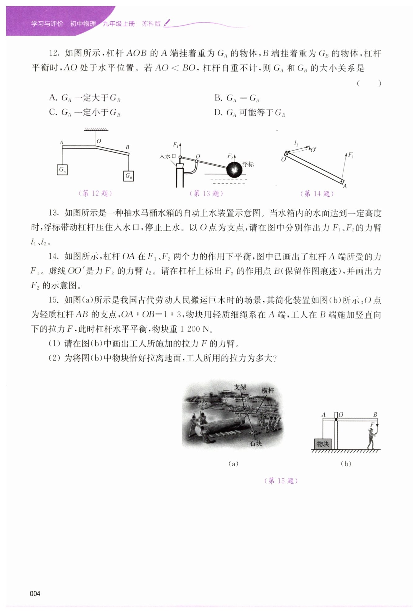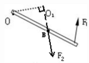 $(2)已知OA:OB=1:3,阻力F_2=G=1200N,動力臂l_1=OB,阻力臂l_2=OA。$