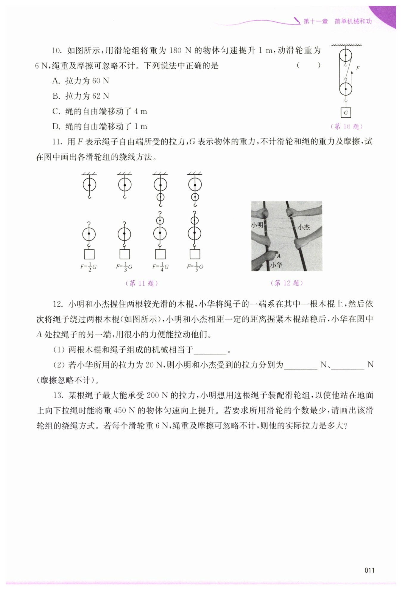 $ F=\frac {1}{n}G_{物},即200\ \mathrm {N}=\frac {1}{n}×450\ \mathrm {N},$