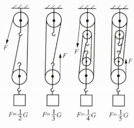 $ 一個動滑輪最多只能有3段繩子承重,如圖所示:$