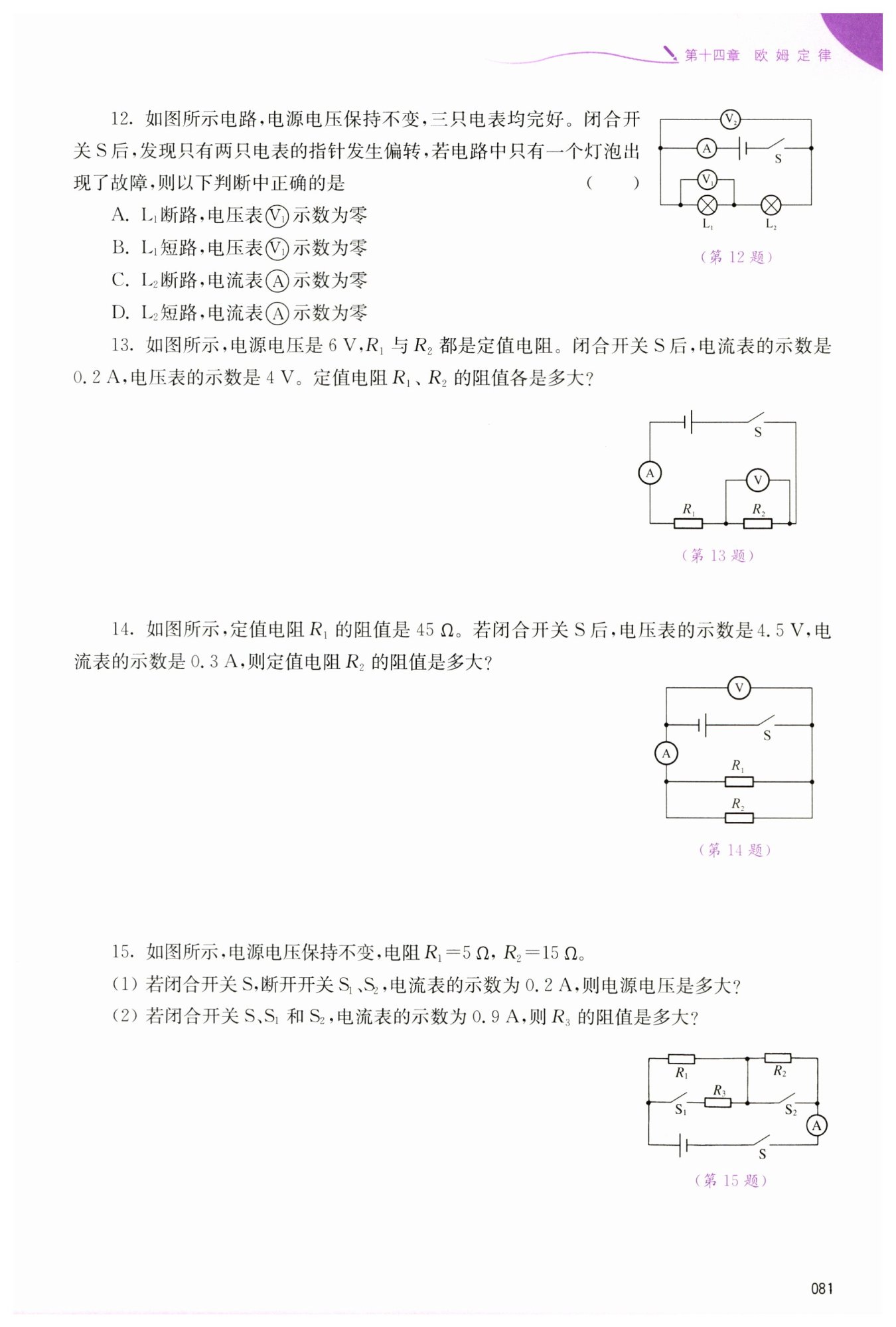 (1)閉合S,斷開$S_{1}$、$S_{2}$時,$R_{1}$與$R_{2}$串聯(lián),$U=I(R_{1}+R_{2})=0.2\ \text{A}\times(5\ \Omega+15\ \Omega)=4\ \text{V};$