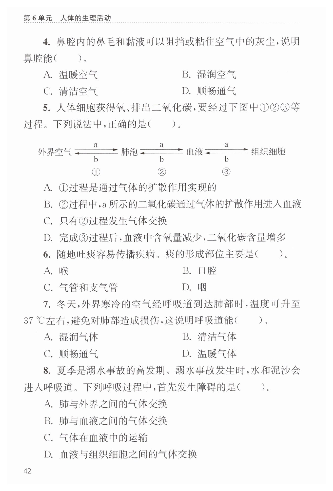 A選項“溫暖空氣”是指鼻腔通過血液循環(huán)加溫吸入的冷空氣,與題目描述的鼻毛和黏液的作用不符;
