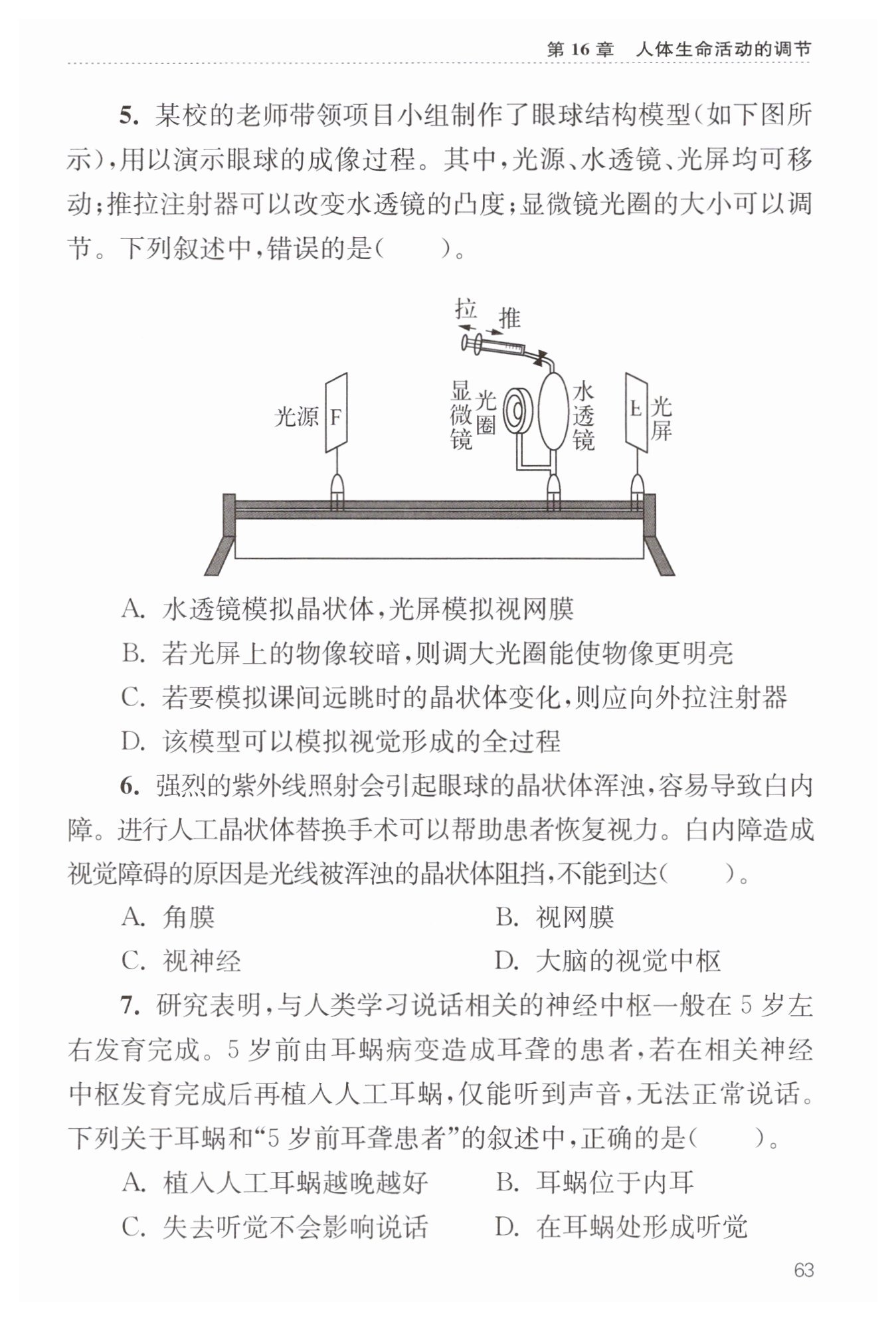 選項C:遠(yuǎn)眺時,眼睛看遠(yuǎn)處的物體,睫狀體放松,晶狀體曲度變小。在該模型中,向外拉注射器可使水透鏡凸度變小,模擬遠(yuǎn)眺時晶狀體的變化,該選項正確。