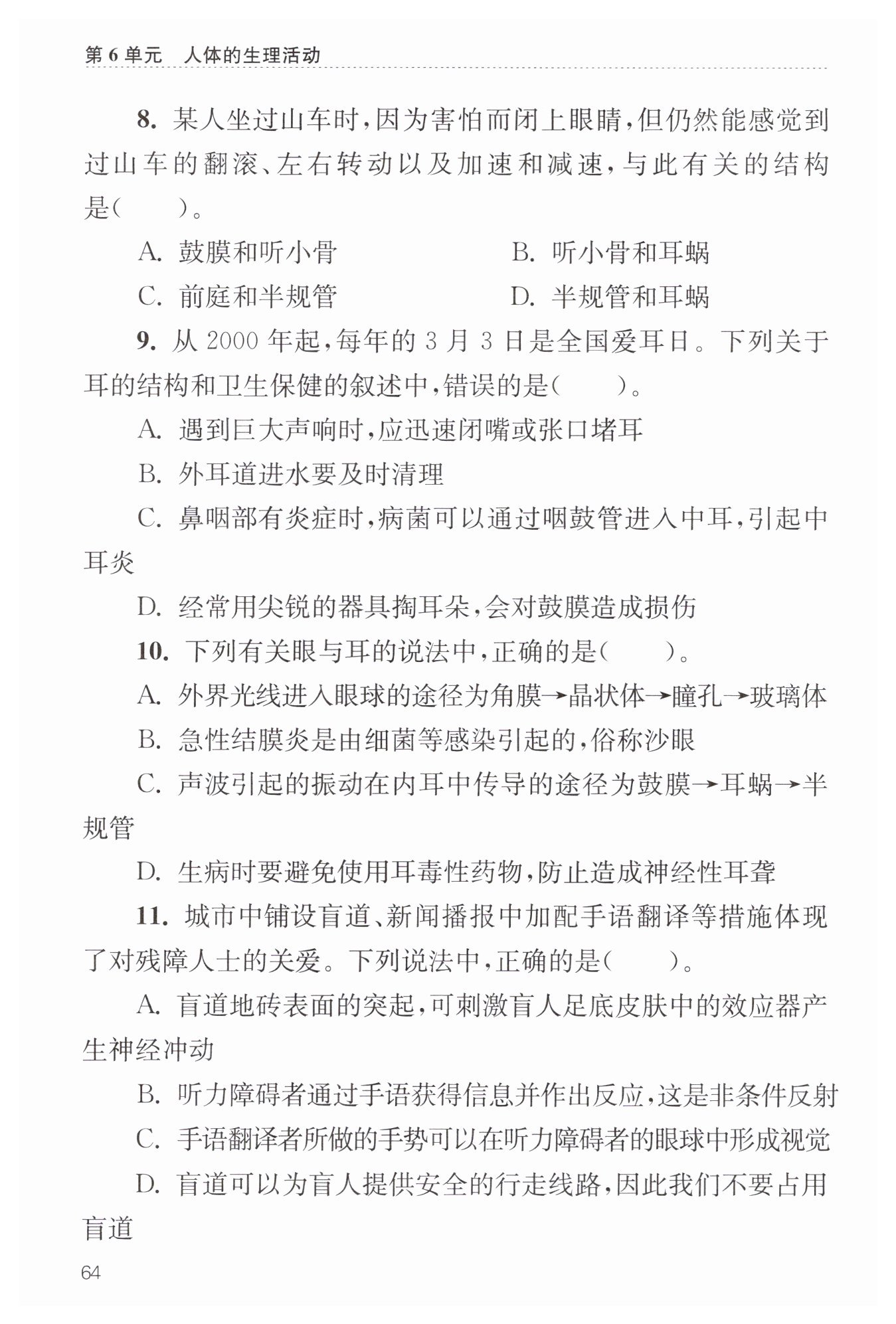 【解析】:本題考查了人體對外界環(huán)境變化的感知以及耳的結(jié)構(gòu)和功能。題干中描述的是某人坐過山車時,雖然閉上眼睛,但仍然能感覺到過山車的翻滾、左右轉(zhuǎn)動以及加速和減速。這些感覺與身體的運動和位置有關(guān),而不是與聲音有關(guān)。在耳的結(jié)構(gòu)中,前庭和半規(guī)管是負責感知身體運動和位置的重要部分。前庭主要感知身體的直線運動,而半規(guī)管則主要感知身體的旋轉(zhuǎn)運動。因此,與此有關(guān)的結(jié)構(gòu)應該是前庭和半規(guī)管。