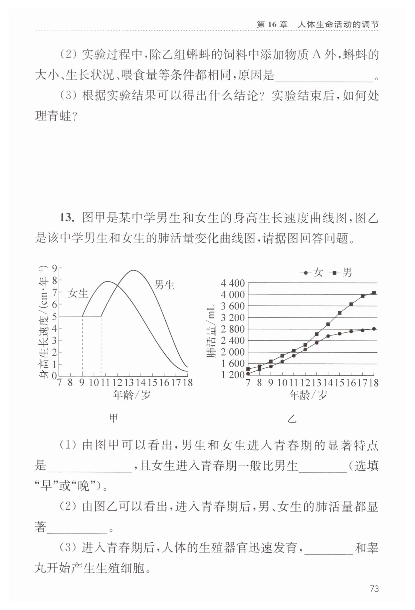 (2)圖乙展示的是該中學(xué)男生和女生的肺活量變化曲線圖,從圖中可以看出,進(jìn)入青春期后,男、女生的肺活量都顯著增加。