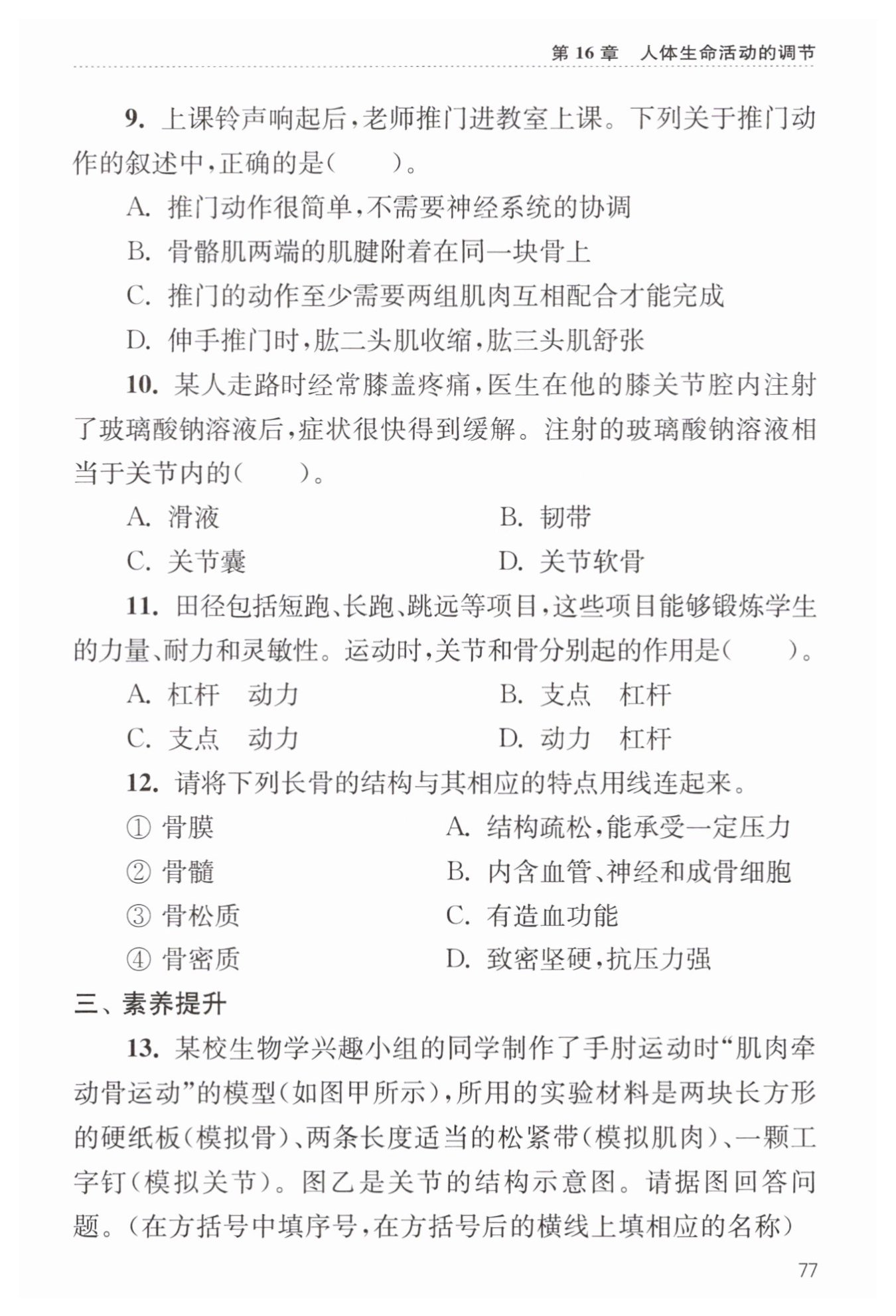 【解析】:本題考察的是人體運(yùn)動(dòng)系統(tǒng)中的動(dòng)作完成機(jī)制。人體完成一個(gè)動(dòng)作需要神經(jīng)系統(tǒng)的調(diào)節(jié)和多個(gè)系統(tǒng)的配合,因此A選項(xiàng)“推門動(dòng)作很簡單,不需要神經(jīng)系統(tǒng)的協(xié)調(diào)”是錯(cuò)誤的。骨骼肌兩端的肌腱是分別附著在不同的骨上,通過收縮和舒張來牽引骨骼運(yùn)動(dòng),所以B選項(xiàng)“骨骼肌兩端的肌腱附著在同一塊骨上”也是錯(cuò)誤的。一個(gè)動(dòng)作的完成至少需要兩組肌肉相互配合,一組肌肉收縮時(shí),另一組肌肉舒張,共同完成動(dòng)作,故C選項(xiàng)“推門的動(dòng)作至少需要兩組肌肉互相配合才能完成”是正確的。在伸手推門時(shí),實(shí)際上是肱三頭肌收縮,肱二頭肌舒張,因此D選項(xiàng)“伸手推門時(shí),肱二頭肌收縮,肱三頭肌舒張”是錯(cuò)誤的。