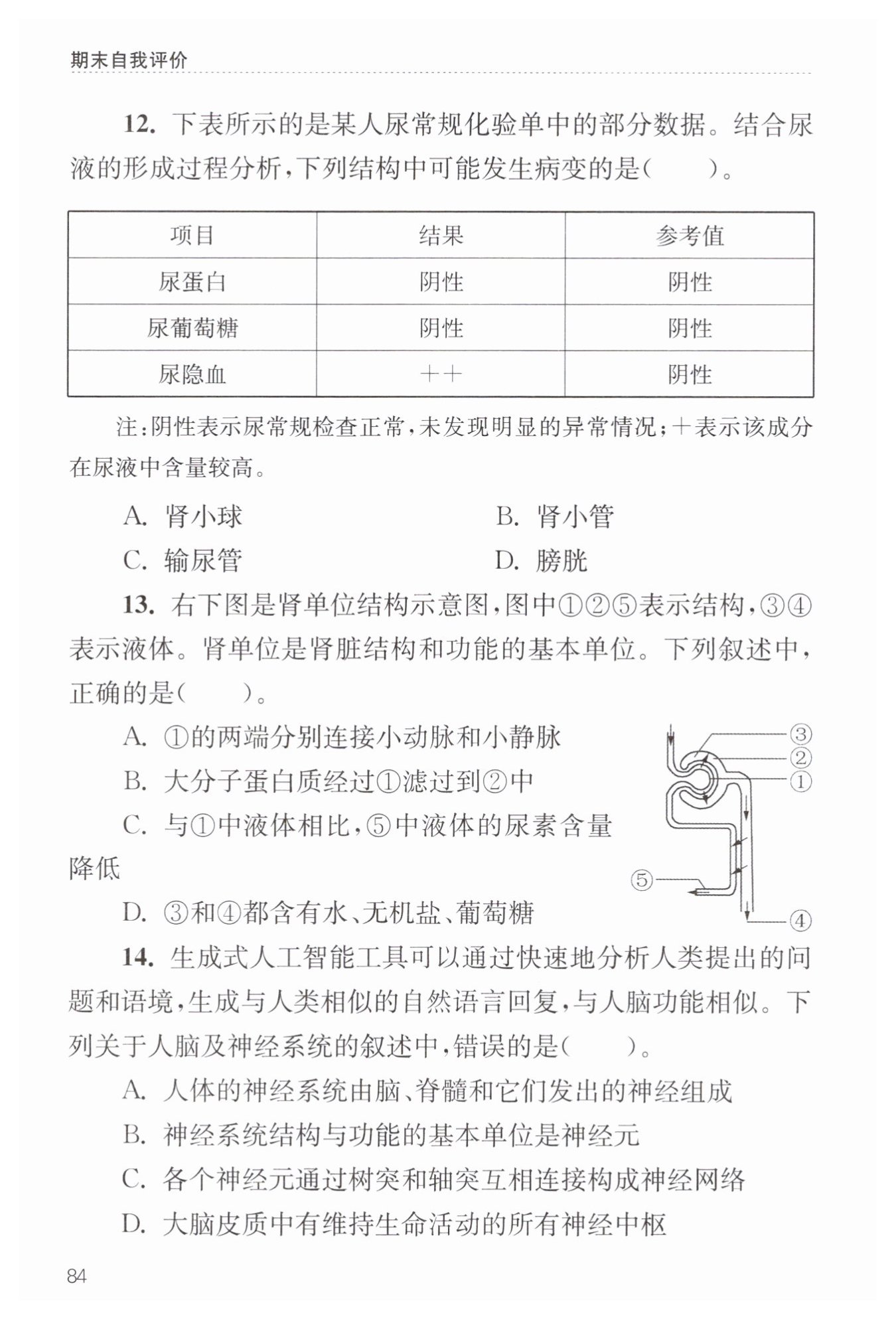 【解析】:分析尿常規(guī)化驗(yàn)單中的數(shù)據(jù),尿蛋白和尿葡萄糖均為陰性,這符合正常參考值,說(shuō)明腎小球的濾過(guò)作用和腎小管的重吸收作用在正常情況下進(jìn)行。然而,尿隱血結(jié)果為++,明顯高于正常參考值的陰性,這表明尿液中紅細(xì)胞含量較高。在尿液的形成過(guò)程中,腎小球負(fù)責(zé)濾過(guò)血液,形成原尿,如果腎小球發(fā)生病變,其濾過(guò)屏障可能受損,導(dǎo)致紅細(xì)胞進(jìn)入原尿,進(jìn)而出現(xiàn)在尿液中。因此,根據(jù)尿常規(guī)化驗(yàn)單的結(jié)果和尿液的形成過(guò)程,可以推斷出可能發(fā)生病變的結(jié)構(gòu)是腎小球。