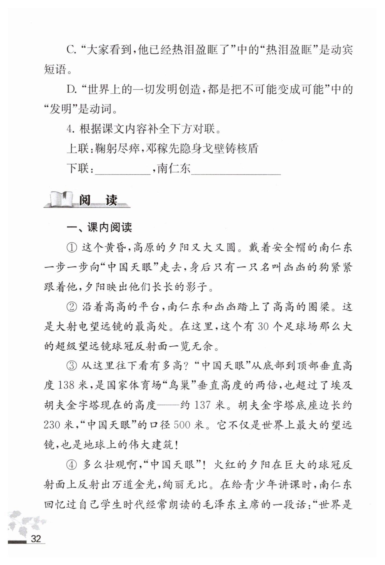 3. 我認為不相悖。畫線句描寫淚珠下落、發(fā)出絕響的樣子,畫面恢宏,浪漫悲壯,暗示南仁東成就的事業(yè)具有震動天地的深刻意義。這是基于事實展開的想象,有助于表現(xiàn)人物,增強感染力。