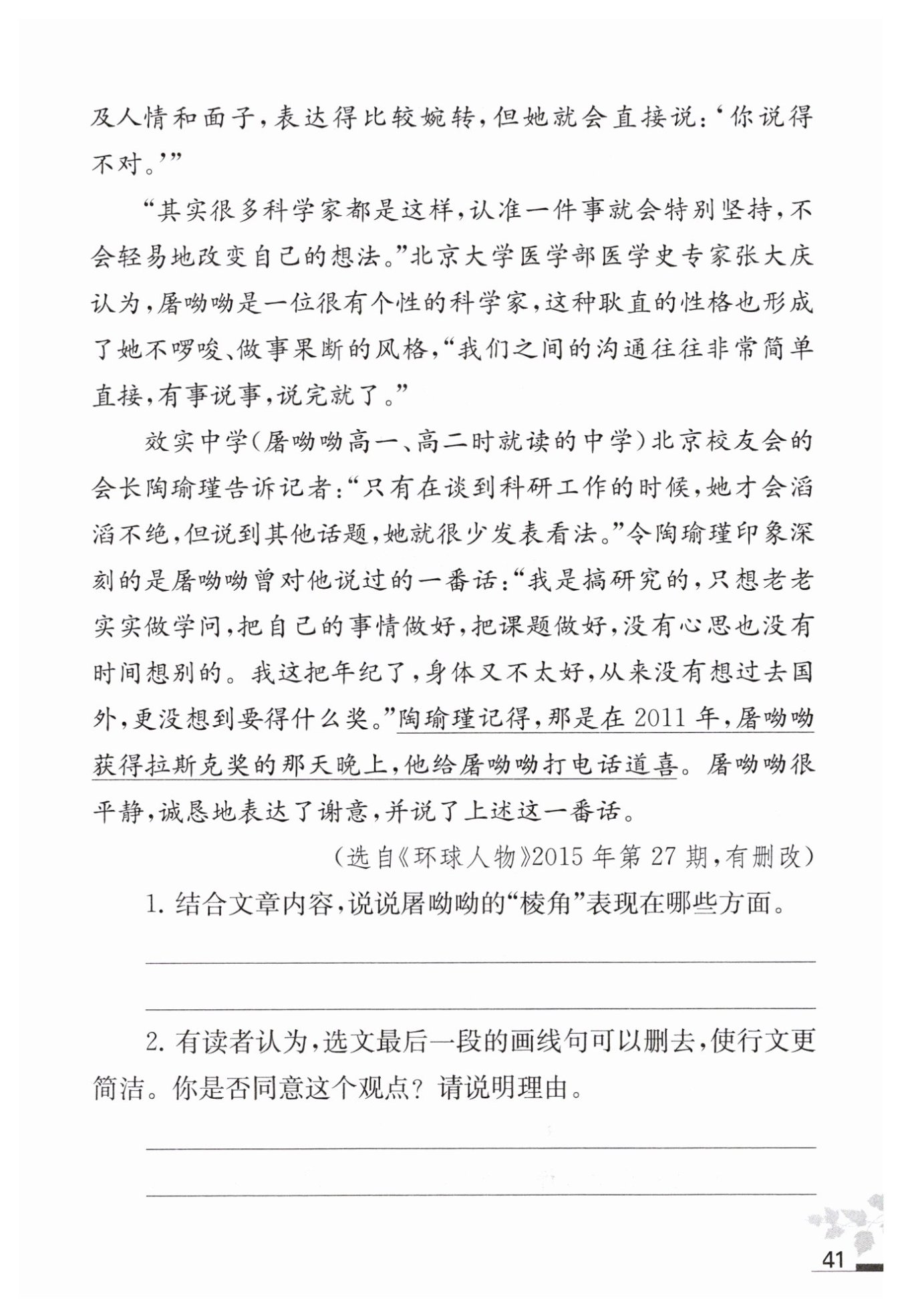 時(shí)間是在獲得拉斯克獎當(dāng)晚,更能凸顯屠呦呦淡泊名利、潛心學(xué)術(shù)的性格,令讀者印象深刻。