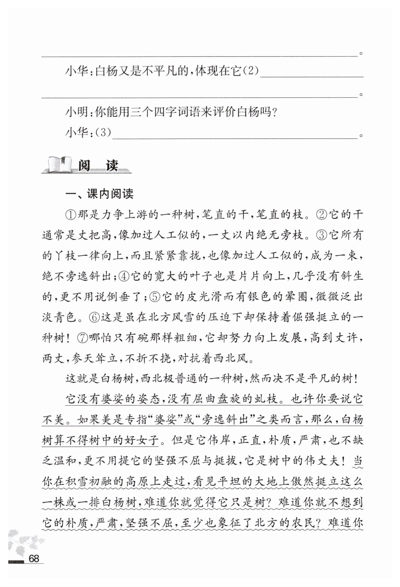2. 不能。畫橫線的句子從外在形象的角度說白楊樹"算不得樹中的好女子",運用欲揚先抑的手法,突出白楊樹內(nèi)在品質(zhì)的美。