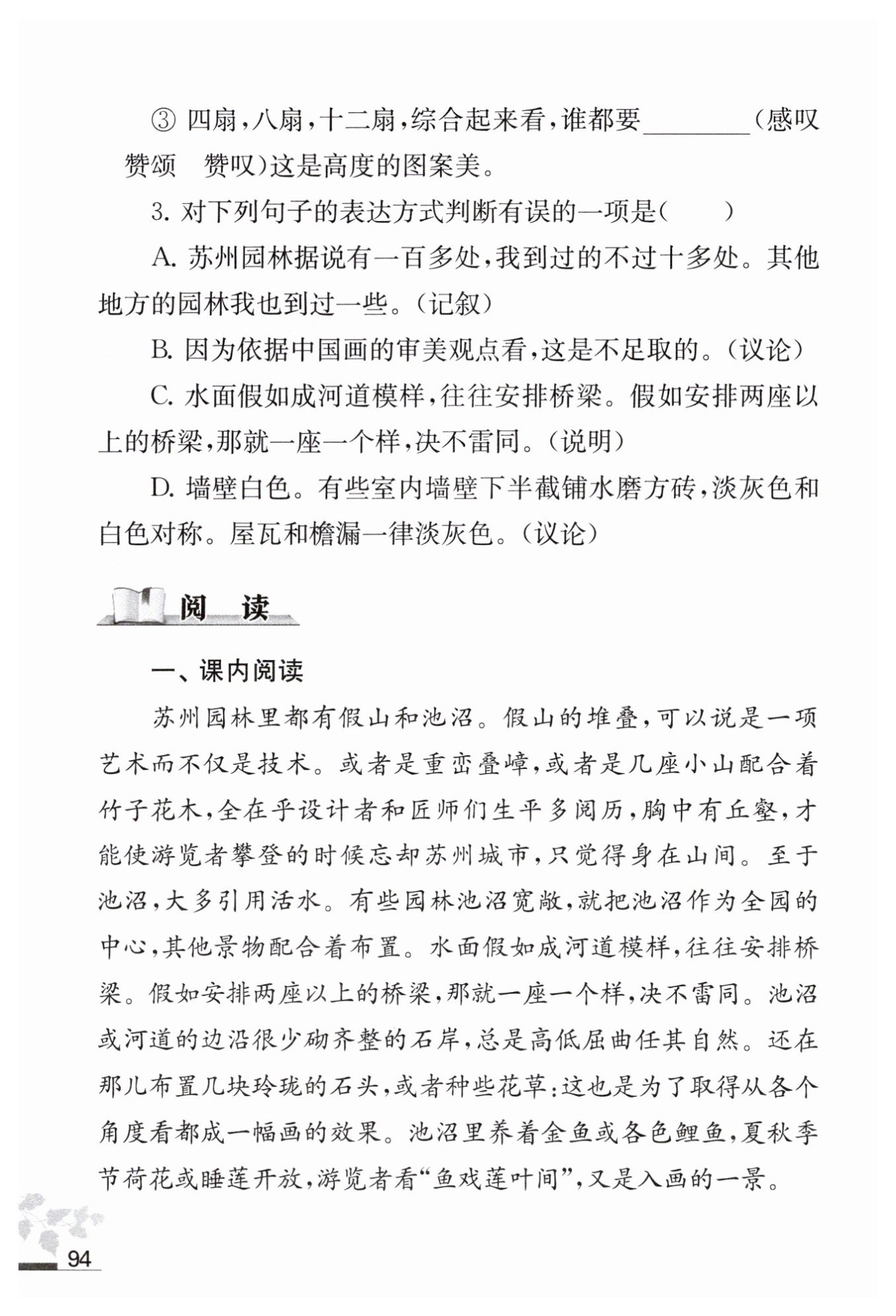 4.[示例一]"至于池沼,大多引用活水"中的"大多",表明大部分的池沼是引用活水的,但也有少數(shù)不引用活水,這樣說符合實際,表達準確。 [示例二]"水面假如成河道模樣,往往安排橋梁"一句中的"往往",表明不少成河道模樣的水面上是要安排橋梁的,但也不排除有一些成河道模樣的水面上沒有安排橋梁,這樣說符合實際,表達準確。