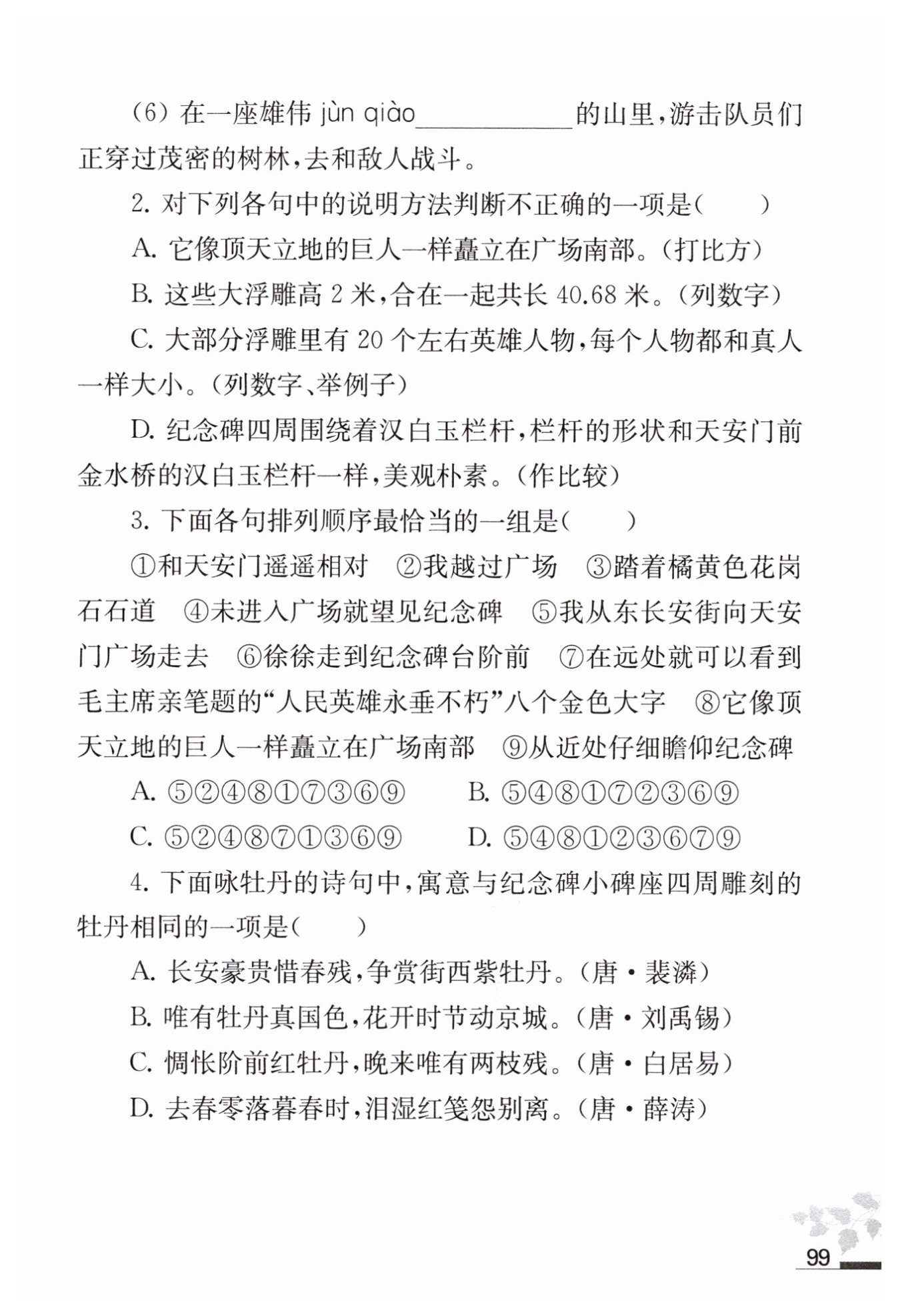 B(A. 描寫豪貴爭賞牡丹的情景 B. 表達(dá)當(dāng)時人們對牡丹的喜愛和尊崇 C. 描寫牡丹殘敗凋落的情況 D. 寫的是傷春之情)