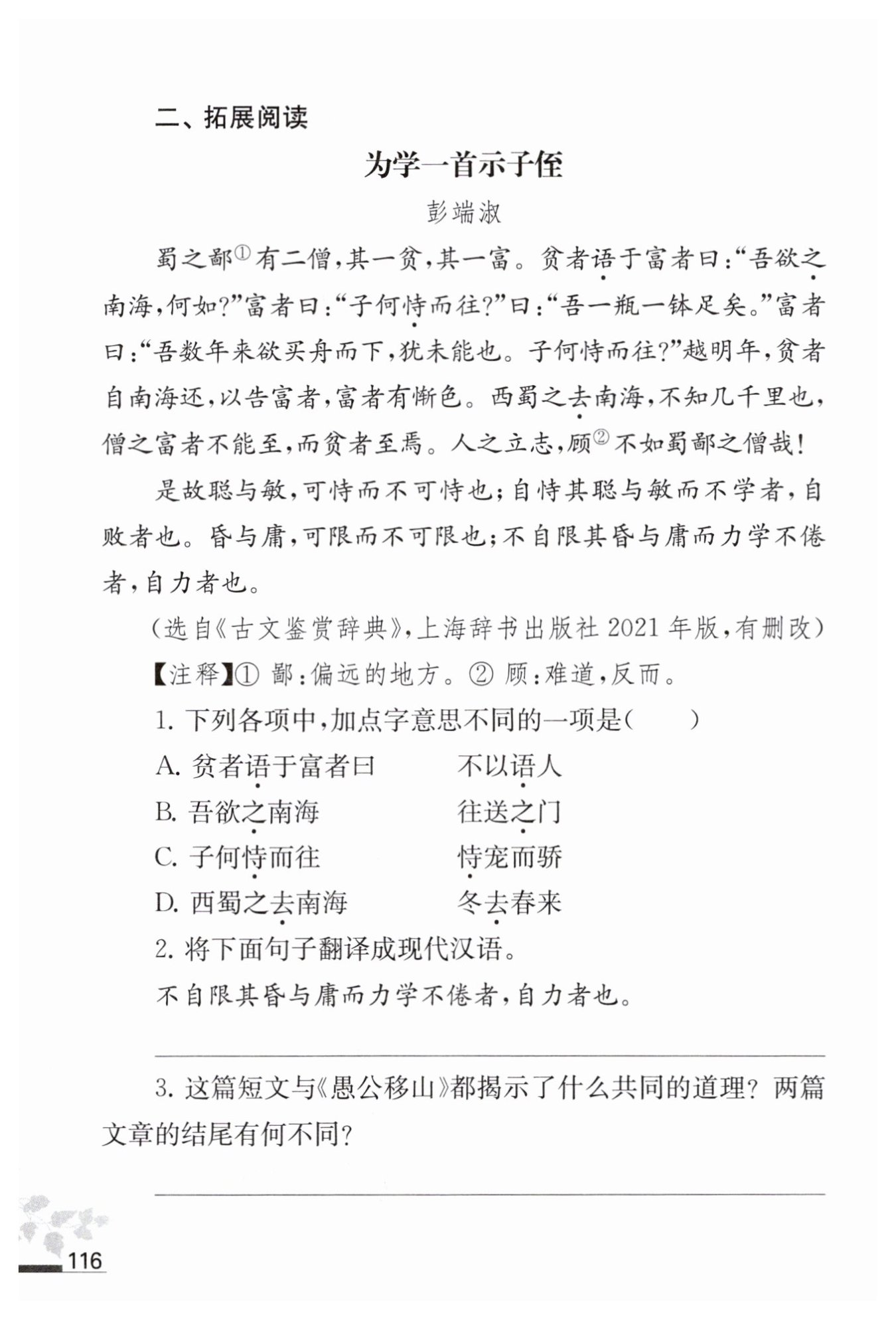 3. 人要有志向,并且能夠付諸行動。這篇短文以議論、說理為結尾,直接點明了故事的寓意;《愚公移山》則以神話故事為結尾,表明了移山的成功,也贊頌了愚公精神的可歌可泣。