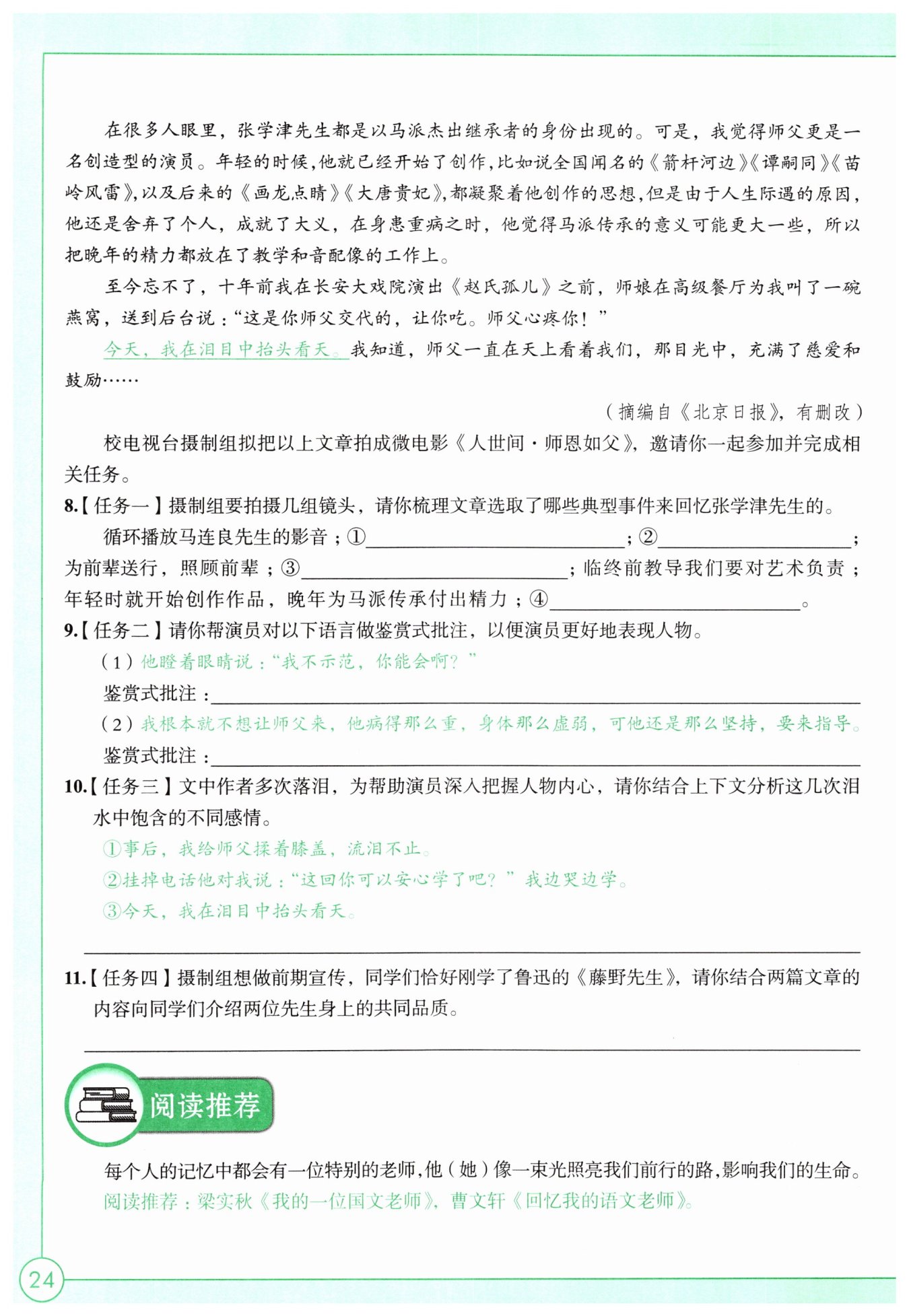 兩位先生都是關(guān)愛學(xué)生、認(rèn)真負(fù)責(zé)的老師。如藤野先生為“我”添改講義、糾正解剖圖等。張學(xué)津先生跪下為“我”示范戲中的動(dòng)作,在“我”演出前托師娘送來燕窩等。