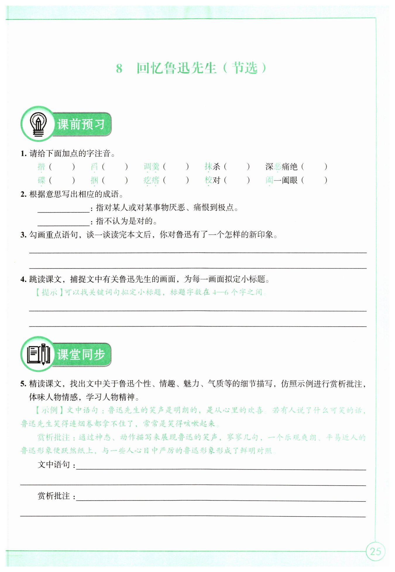 【示例一】文中語句:剛抓起帽子來往頭上一扣,同時左腿就伸出去了,仿佛不顧一切地走去。賞析批注:“抓”“扣”“伸”,這幾個動詞,形神兼?zhèn)涞孛枥L出魯迅的習慣性動作,體現(xiàn)出魯迅敏捷果敢、一往無前的性格特點。【示例二】文中語句:魯迅先生說:“擦一擦,拿著雞吃,手是膩的。”賞析批注:通過語言描寫,展現(xiàn)魯迅先生把校樣分給客人擦手的隨意,突出了魯迅平易謙和的形象。