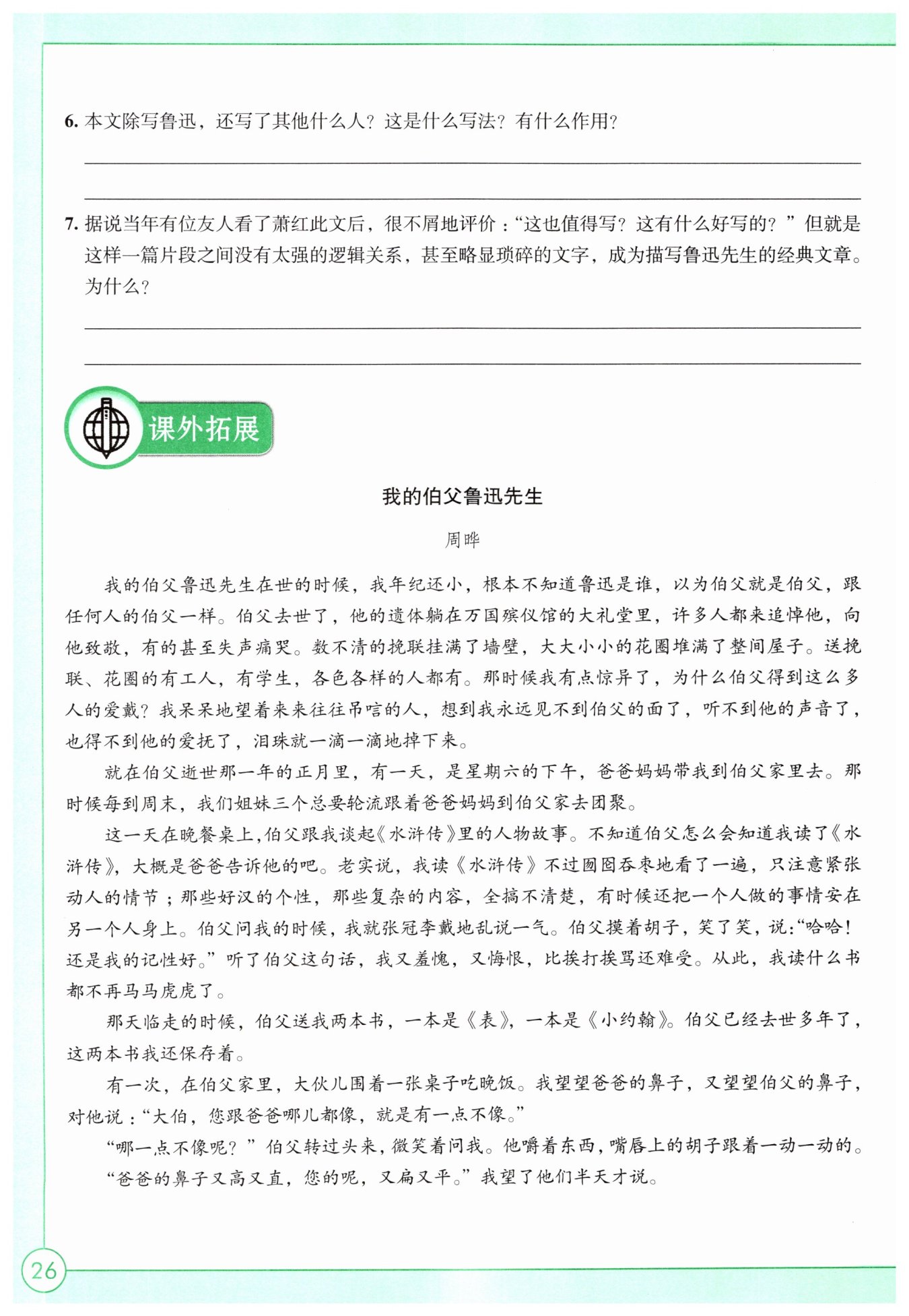 ①還寫了“我”(作者蕭紅)、海嬰、許廣平。②寫他們是從側(cè)面襯托魯迅,起到烘云托月的表達(dá)效果。③寫“我”的親見、親聞,一是使所敘之事更為真實(shí),二是使情感的抒發(fā)更有感人的力量。④寫海嬰,主要是通過海嬰的年幼無知、童言無忌,從側(cè)面表現(xiàn)魯迅對孩子的慈愛。⑤寫許廣平主要通過她的言行,反映魯迅先生的辛勞、樂觀、剛毅。