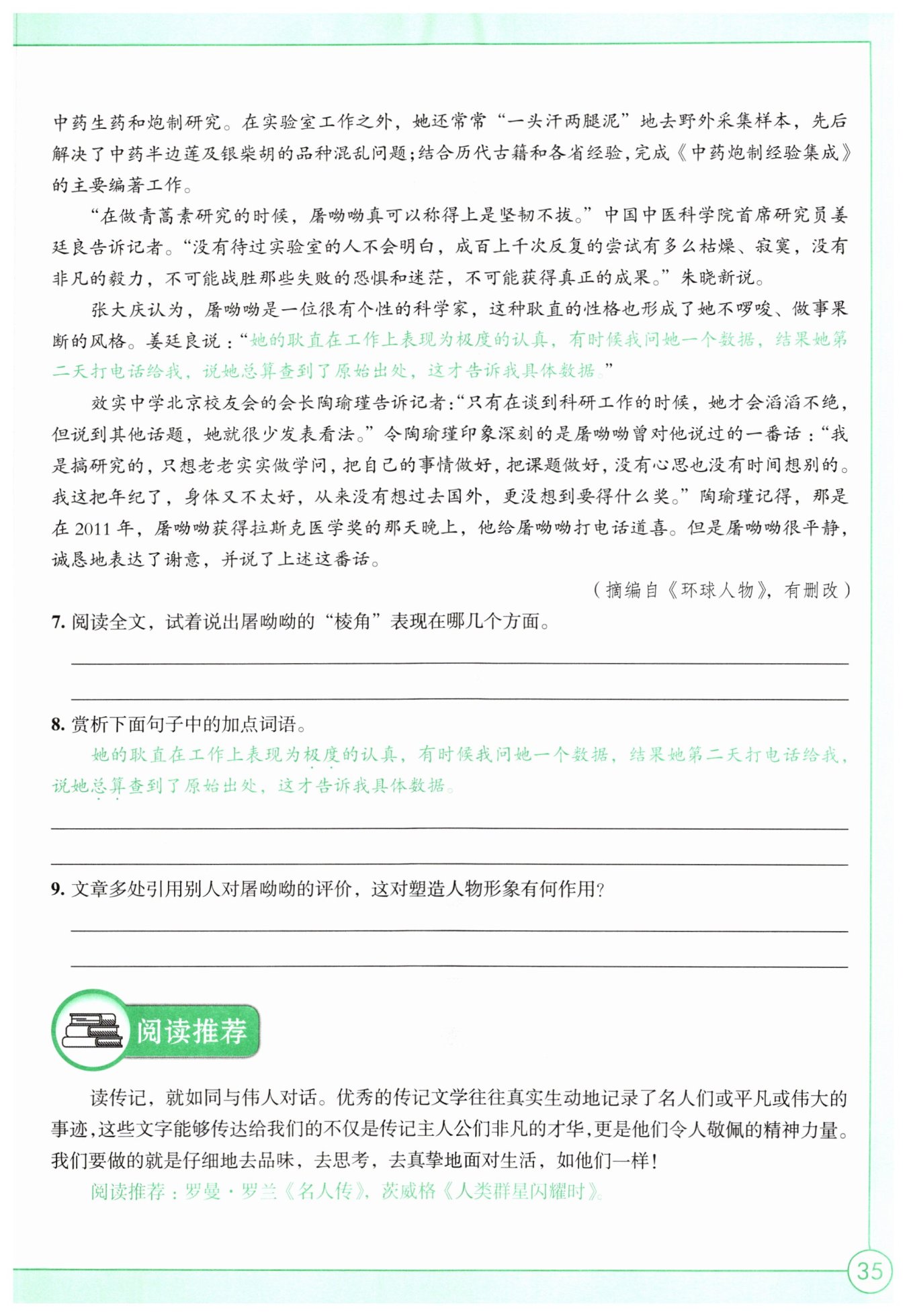 這些話從多個角度、比較全面地展現(xiàn)了屠呦呦的工作作風(fēng)和性格特點,讓讀者了解到一個更