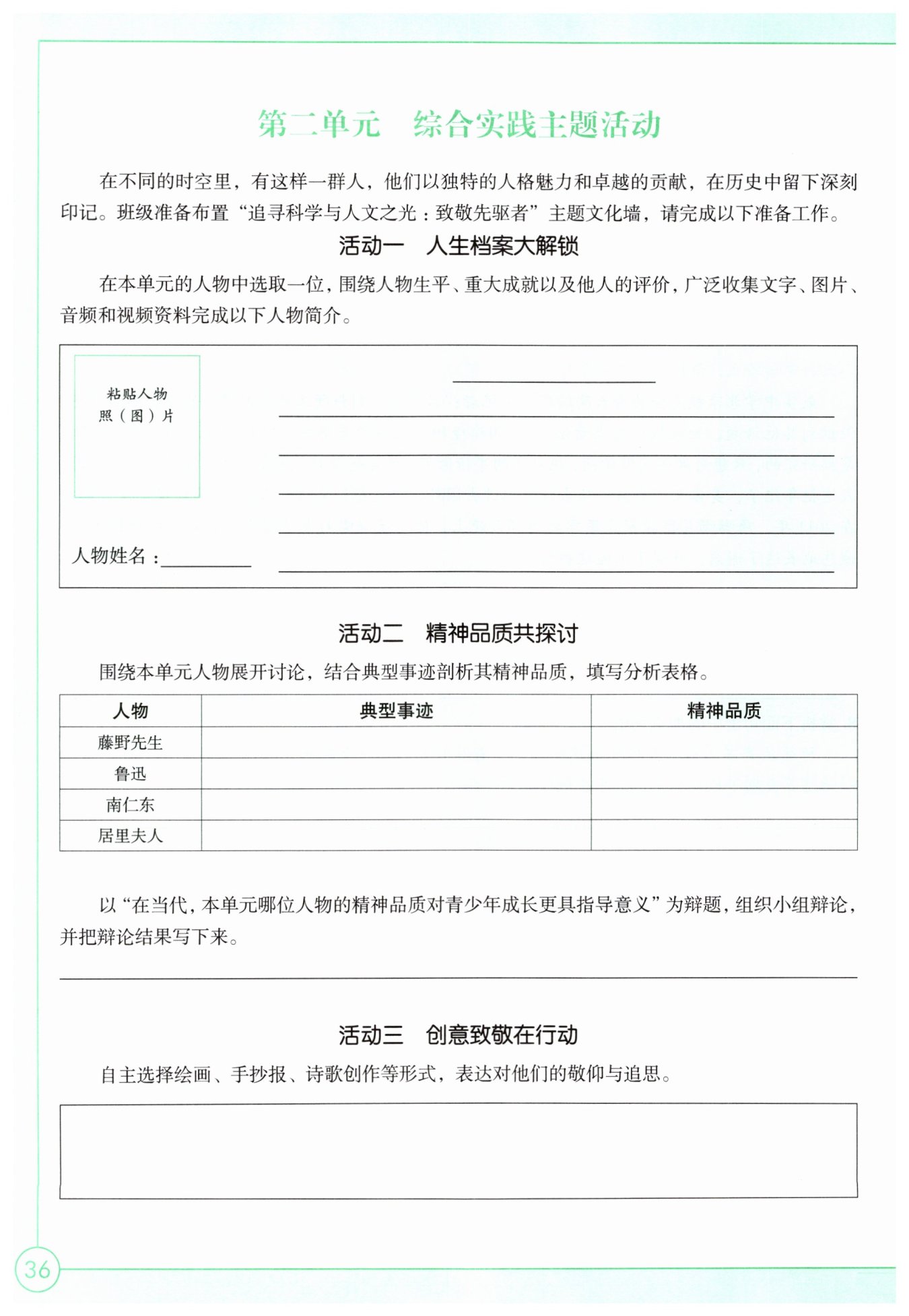 回憶八年級上冊相關(guān)單元人物事跡及精神品質(zhì),結(jié)合課文內(nèi)容填寫表格;辯論圍繞當(dāng)代青少年成長需求,分析人物精神指導(dǎo)意義。