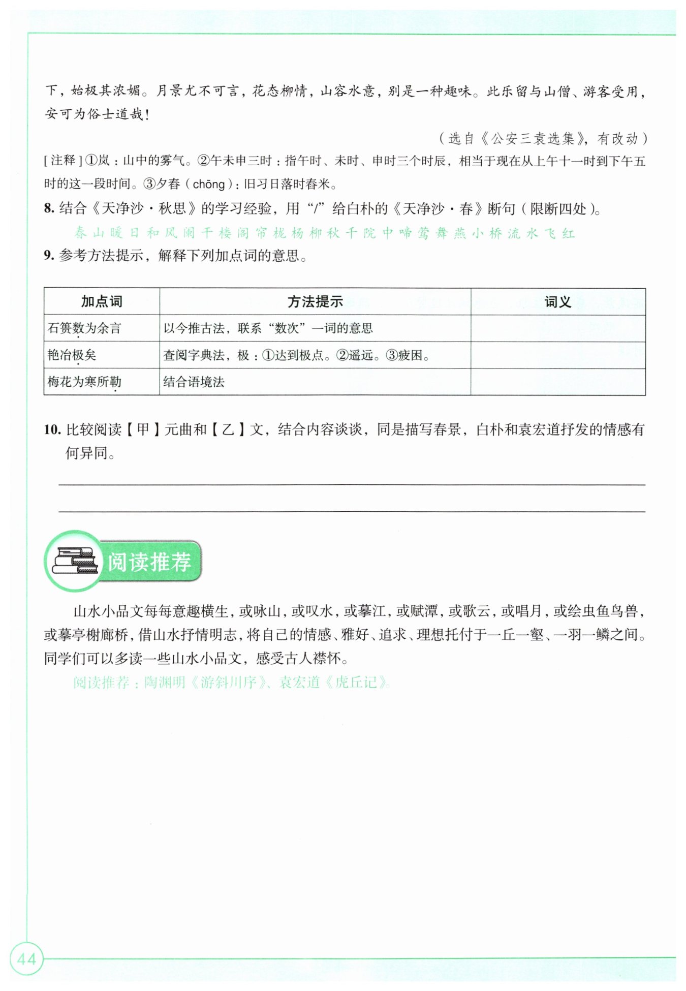 等景象,展現(xiàn)了春天的生機(jī)勃勃和美好?!段骱吩敿?xì)描寫了西湖的美景,如山色、春花、和風(fēng)、湖水等,展現(xiàn)了西湖的自然美景和獨特的韻味。 ②不同點:《天凈沙·春》中庭院喧鬧的生活場景反映了作者對美好生活的向往與熱愛。袁宏道借月景表達(dá)了不與世俗同流合污的高雅志趣。