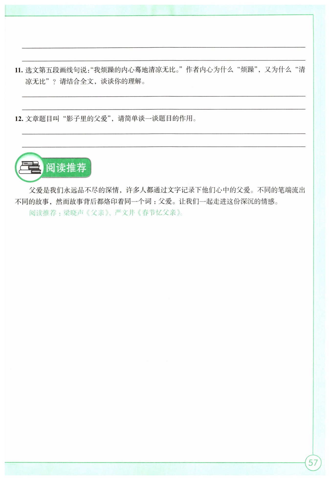 煩躁是因?yàn)樘鞖庋谉犭y耐,而父愛使“我”感動(dòng),所以覺得清涼無比。