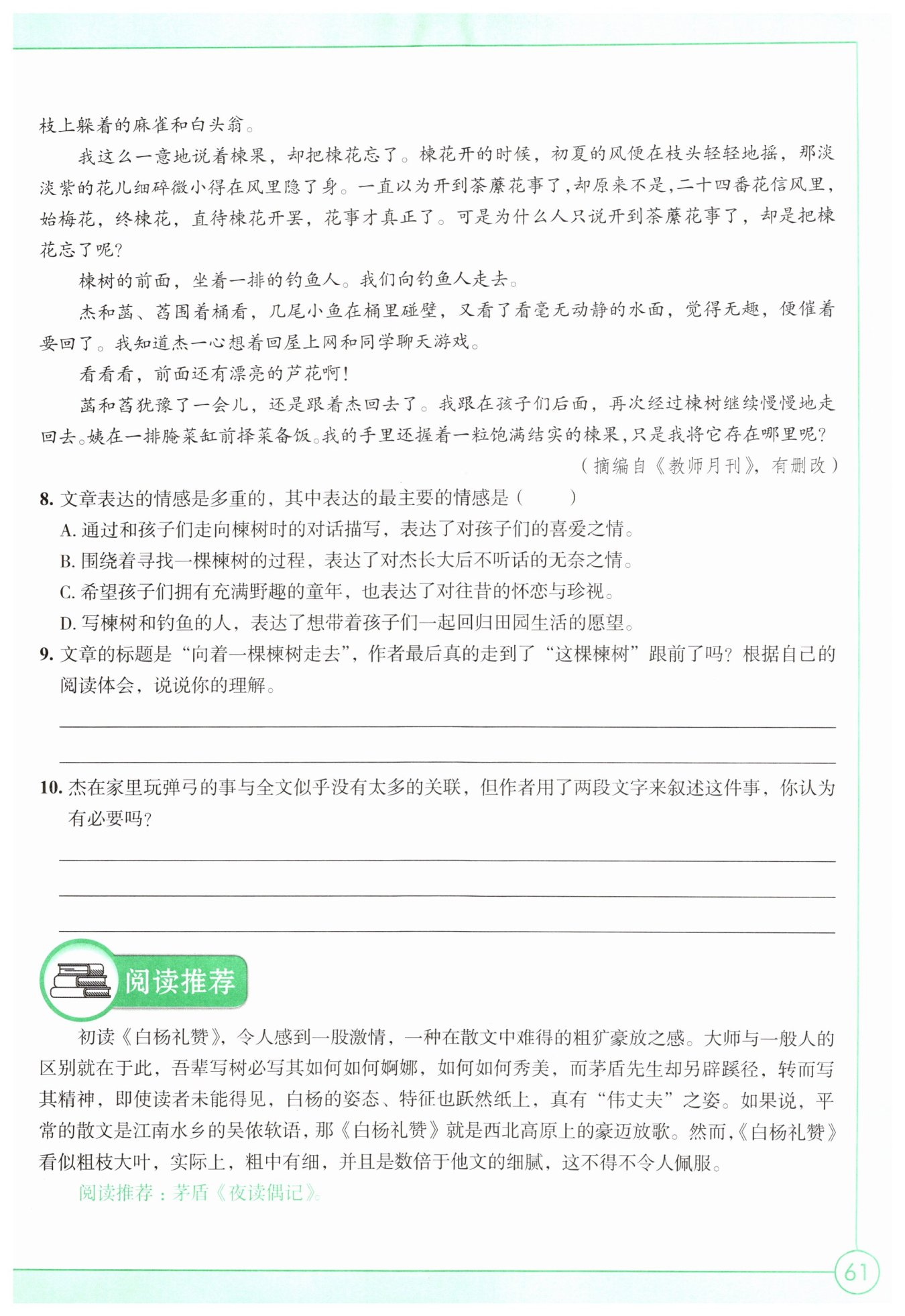 托。她想帶著孩子們一起去野外摘楝樹果,想讓孩子們享受這樣的樂趣,但是侄女們竟然對長在家門口的楝樹一無所知,兒子杰更是一直抵觸這樣的行為,想抓緊時間回去上網(wǎng)和同學聊天游戲。 特別是文章最后一句“只是我將它存在哪里呢”,流露出作者內(nèi)心的惆悵、失落和無奈,因為自己的這種行為并不被孩子們認可,孩子們感受不到楝樹帶來的樂趣。所以,即使他們?nèi)藖淼搅碎瑯涞母埃窈退枷胍矝]有抵達。其實,童年是回不去的,楝樹是作者童年生活的象征。