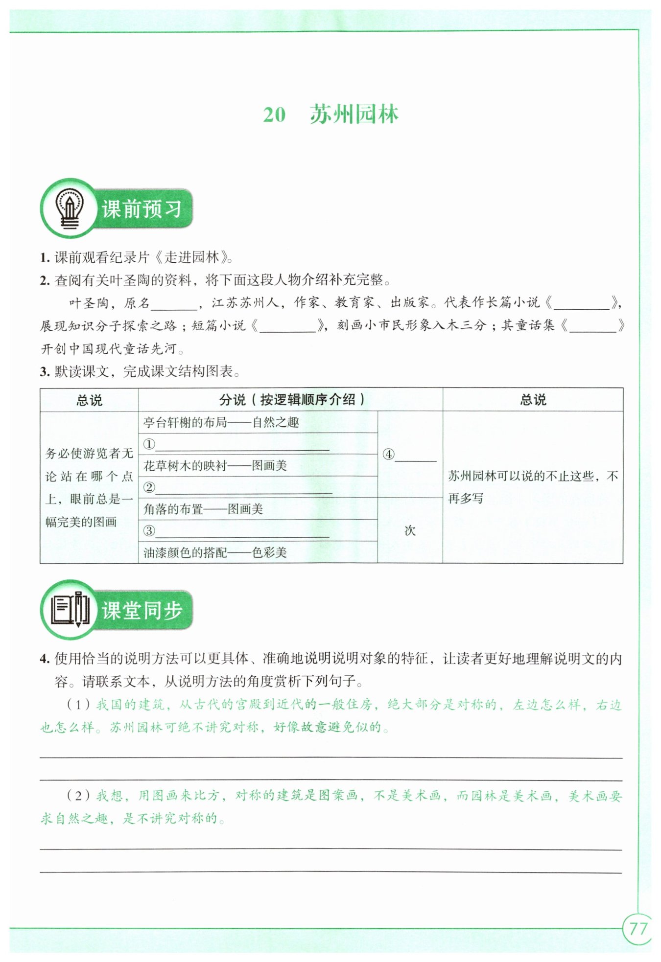 進(jìn)行比較,生動形象地突出了蘇州園林“不講究對稱”、充滿自然之趣的特點(diǎn)。