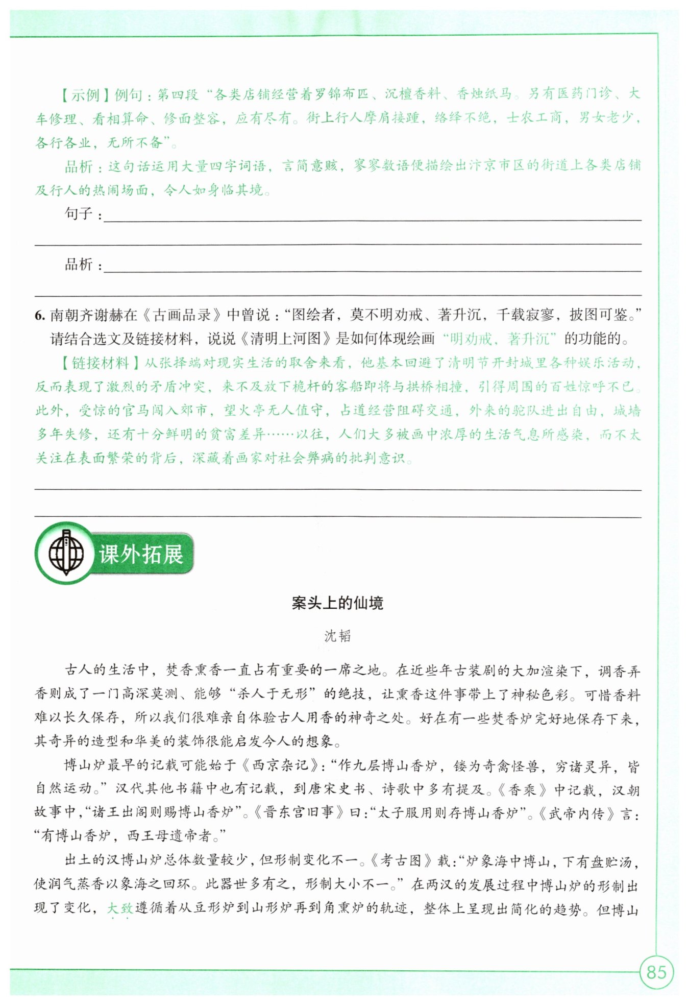 此句用“迅速發(fā)展”“嚴(yán)格界限”“空前繁榮”等四字短語(yǔ),簡(jiǎn)潔概括北宋商業(yè)手工業(yè)發(fā)展