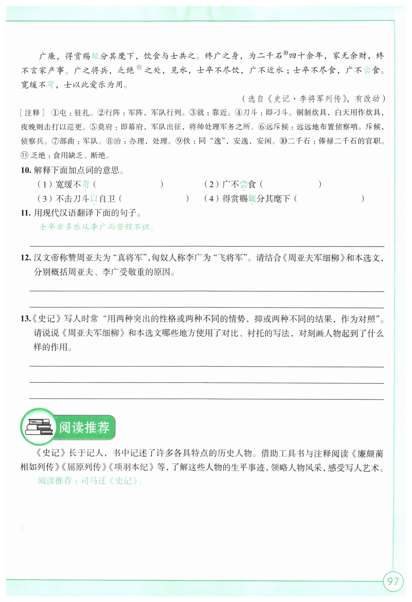 在細(xì)柳軍處周亞夫“持兵揖”“不拜”形成對(duì)比,體現(xiàn)了周亞夫恪盡職守、剛正不阿。③出營(yíng)門后群臣的“驚”和文帝的“稱善者久之”形成對(duì)比,表現(xiàn)出文帝的賢明、識(shí)大體。④本選文中李廣與程不識(shí)對(duì)待士卒的不同要求形成對(duì)比,士卒對(duì)跟隨李廣和程不識(shí)的態(tài)度也形成對(duì)比,寫出了李廣體恤部下、治軍簡(jiǎn)易的特點(diǎn)。