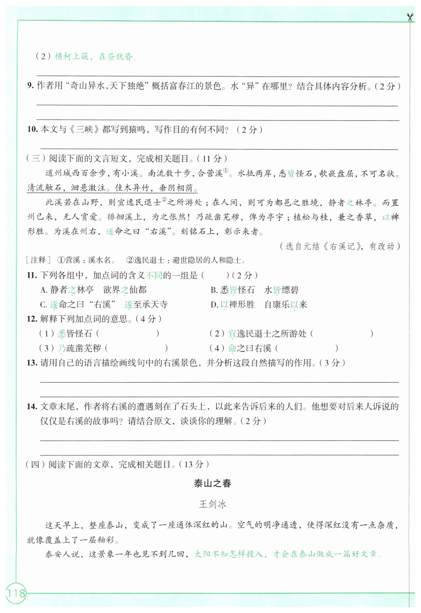 15.A 16.(1)這句話與“造化鐘神秀”都運(yùn)用了擬人的修辭手法,給自然景物賦予了人的情感和行為,使語(yǔ)言更加生動(dòng),富有感染力。同時(shí),也體現(xiàn)了作者對(duì)自然造化的贊嘆和敬畏之情,使文章充滿了詩(shī)情畫意。(2)“劃”“沖”“拉”這三個(gè)動(dòng)詞不僅描繪了鷹飛翔的動(dòng)作,更賦予了鷹一種輕盈、自由、充滿力量的感覺(jué),體現(xiàn)了作者對(duì)鷹的贊美和對(duì)自然景色的熱愛(ài)。鷹與陽(yáng)光、山巔、天空融為一體,展現(xiàn)了生命與自然的和諧之美。17.①挑山工不僅為泰山的旅游業(yè)和文化建設(shè)作出了重要貢獻(xiàn),更通過(guò)他們的堅(jiān)韌和奉獻(xiàn)精神,成為泰山精神的象征和激勵(lì)人們不斷攀登、超越自我的榜樣。②文章通過(guò)對(duì)挑山工的描寫,進(jìn)一步深化了對(duì)泰山的贊美和對(duì)人類奮斗精神的禮贊。18.【示例一】我想使用場(chǎng)景一。這個(gè)場(chǎng)景中的松柏在石縫中直立,在山崖邊斜逸,甚至拉起了葛藤,展現(xiàn)了泰山植物頑強(qiáng)的生命力和堅(jiān)韌不屈的個(gè)性。這與“奮進(jìn)中國(guó)”的主題契合,象征著中華民族在面對(duì)困難時(shí)的堅(jiān)韌和頑強(qiáng),寓意我們?cè)谌魏纹D難環(huán)境下都能茁壯成長(zhǎng),不斷前行。選擇這個(gè)場(chǎng)景,可以強(qiáng)化短視頻中對(duì)積極向上、勇往直前精神的體現(xiàn)?!臼纠课蚁胧褂脠?chǎng)景二。這個(gè)場(chǎng)景描繪了登山者們?cè)谏降郎吓实堑膲延^景象,他們緊密團(tuán)結(jié),充滿激情,象征著中國(guó)人民團(tuán)結(jié)一心、積極進(jìn)取的精神風(fēng)貌。這與“奮進(jìn)中國(guó)”的主題高度一致,展現(xiàn)了人們勇攀高峰、挑戰(zhàn)自我的決心和勇氣,也寓意國(guó)家和民族不斷攀登發(fā)展高峰,創(chuàng)造輝煌成就。選擇這個(gè)場(chǎng)景,可以使短視頻更具感染力,激發(fā)觀眾的共鳴和奮進(jìn)之情。