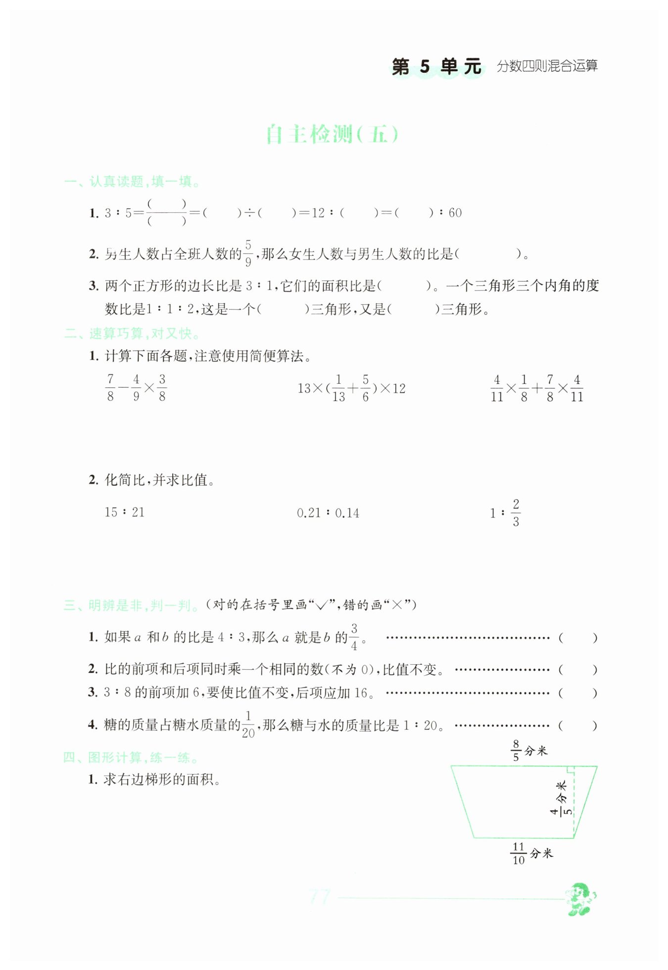 ?$ (\frac {11}{10}+\frac {8}{5})×\frac {4}{5}÷2=\frac {27}{25}($?平方分米?$)$?