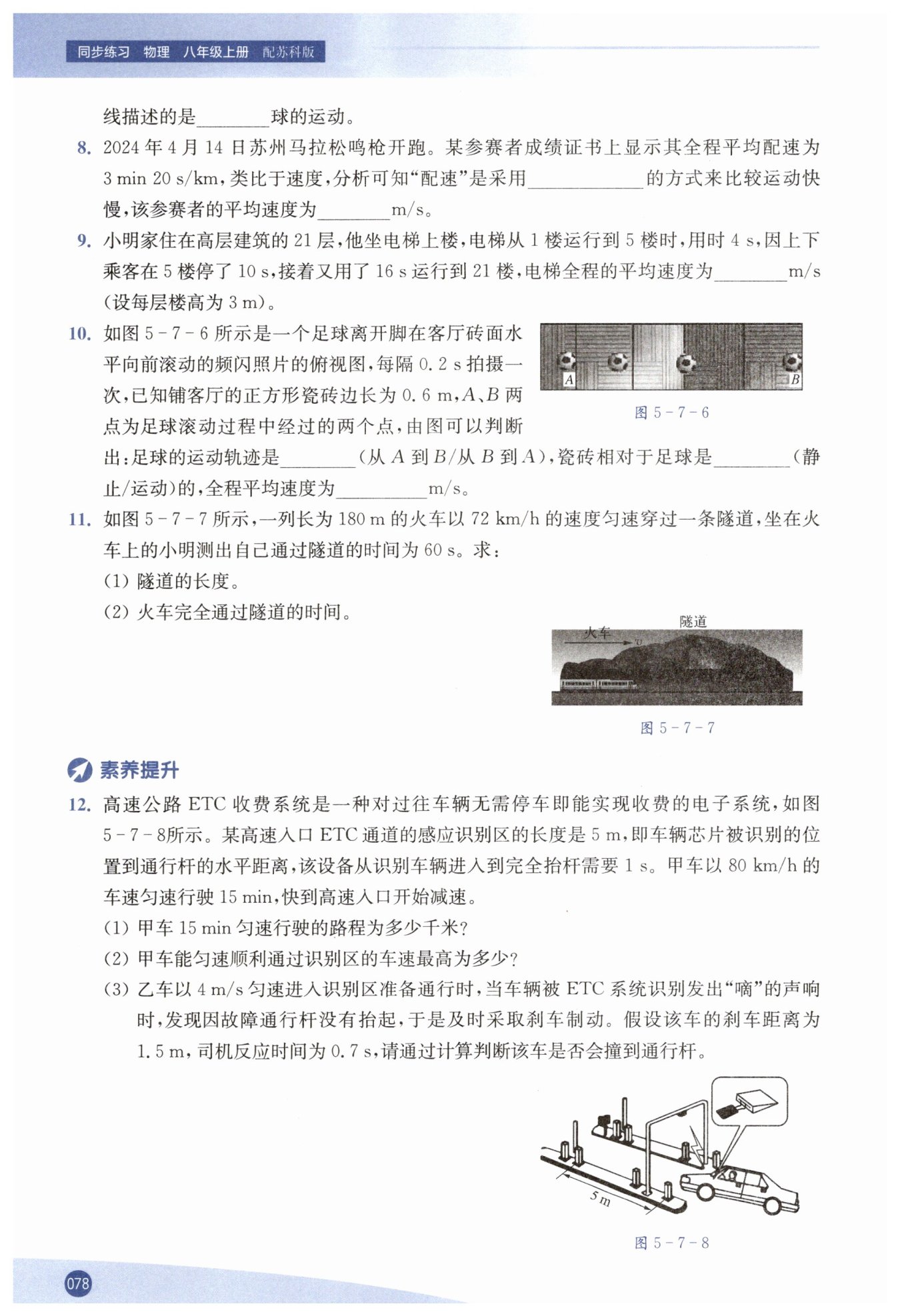 (2)火車完全通過隧道的路程$s = L + L_{\text{車}} = 1200\ \text{m} + 180\ \text{m} = 1380\ \text{m},$