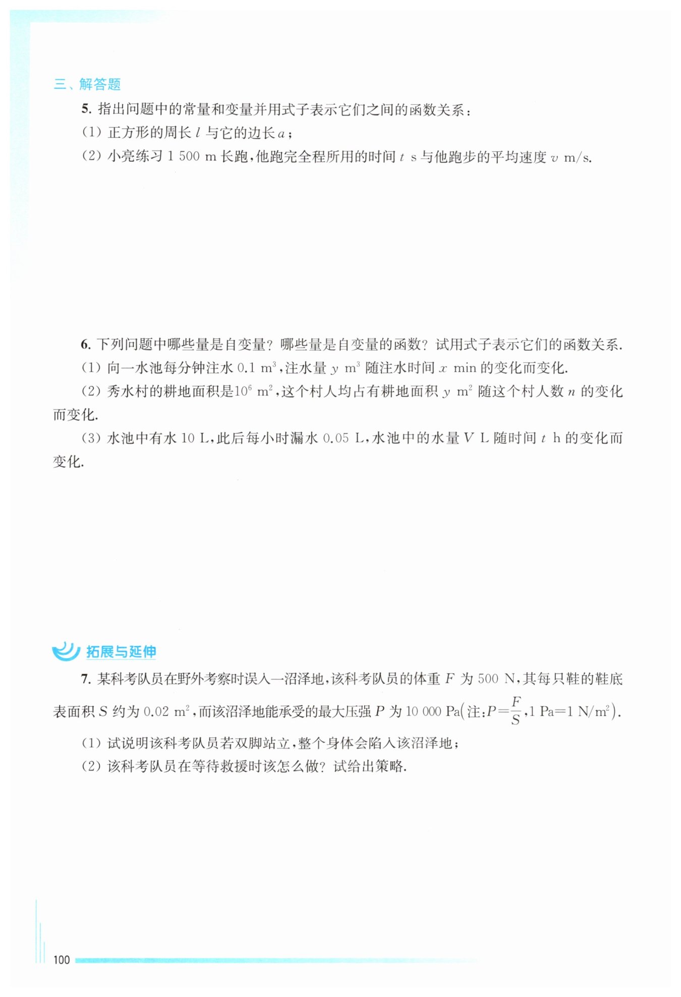?$(3)$?自變量是?$ t ,$??$ V $?是?$ t $?的函數(shù),函數(shù)關(guān)系為?$ V=10 - 0.05\ \mathrm {t} (t\geq 0 $?且?$ 10 - 0.05\ \mathrm {t}\geq 0 )$?