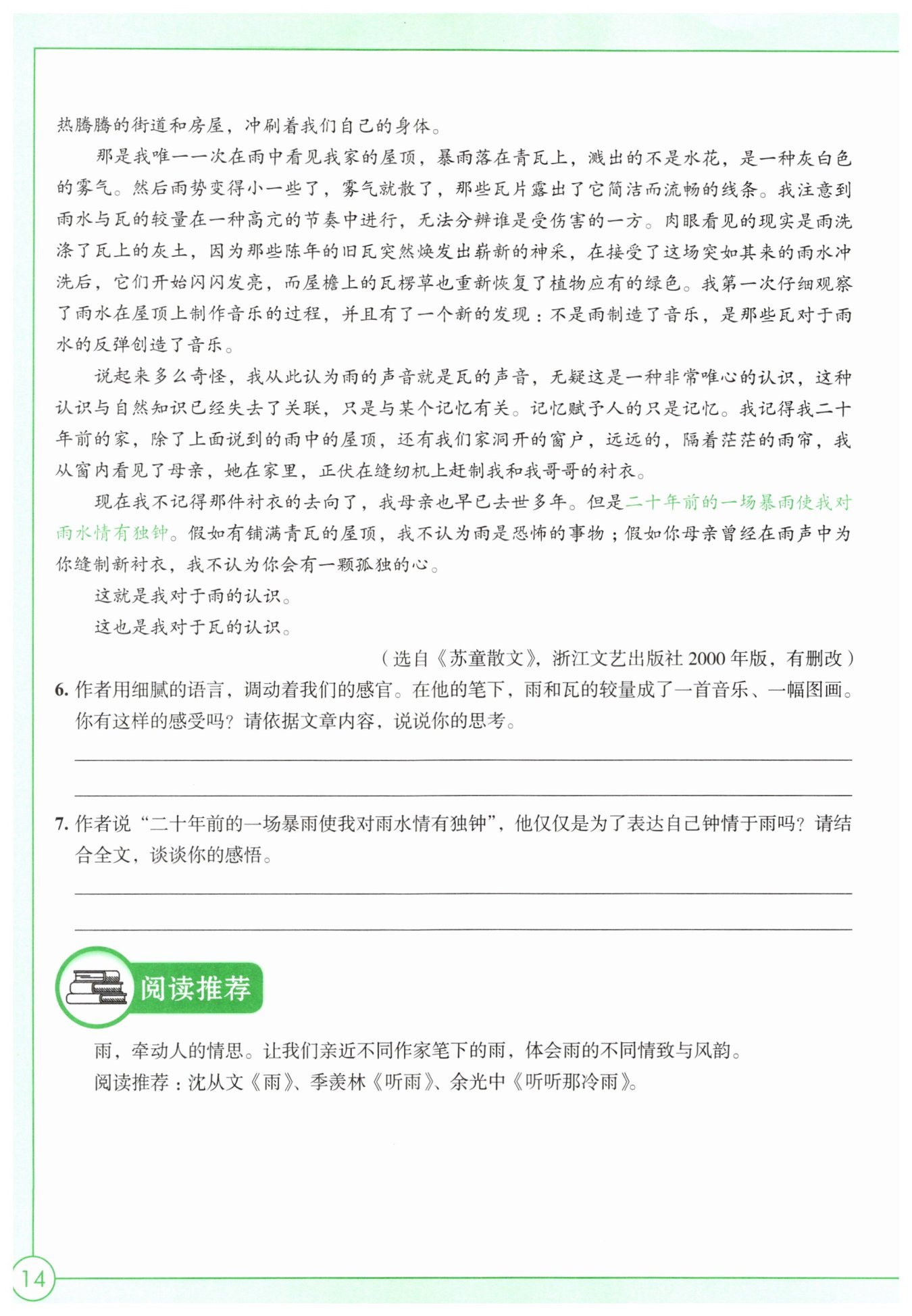 當(dāng)空炸響,逐漸停歇時(shí)又小心翼翼地滴滴答答。雨落在瓦上的聲音,在作者筆下如同一首旋律、節(jié)奏不斷變換的奇特的交響樂(lè)。在細(xì)膩的語(yǔ)言中,讀者能夠感受到雨的聲音、節(jié)奏、過(guò)程,甚至于雨的性情。②在屋頂觀雨時(shí),暴雨落在青瓦上濺起灰白色的霧氣,與作者想象中的水花不同。此處細(xì)膩真實(shí)的畫面,如同一幅速寫。而雨勢(shì)漸小,陳年舊瓦煥發(fā)出嶄新的神采,瓦楞草也顯出綠色,鮮亮的色澤又仿佛出現(xiàn)在讀者眼前,畫面古樸雅致,形象鮮明。